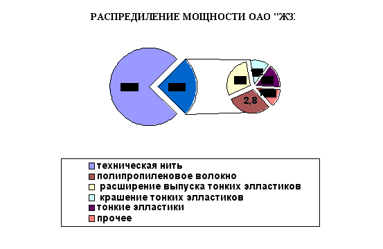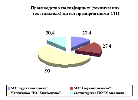 Существует несколько других поставщиков вышеперечисленного сырья: Гродненское ПО "Химволокно" (Беларуссия) и ОАО "Курскхимволокно" (Россия). Всё необходимое дополнительное оборудование для осуществления проекта у предприятия имеется в том числе: 60 собственных трансформаторных подстанций, парокотельный, азотно-кислородный, аммиачно-холодильный цехи, которые поддерживают функционирование производства, полностью обеспечивают его теплом, холодом, азотом, сжатым воздухом; в структуре завода имеется ремонтно-механический и ремонтно-строительный цеха. Капитальные и текущие ремонты оборудования, сооружений и строений, изготовление несложных за исполнением запасных частей осуществляется собственными силами. 4.6.АНАЛИЗ ОТРАСЛИРынок.Конъюктура украинского рынка химических волокон в период с 1990 – 1998 гг. складывалась под воздействием общих экономических процессов в стране. Продолжительный кризис промышленного производства привел к сокращению производства у основного потребителя химволокон – текстильной промышленности. Несмотря на это, производители химических волокон в Украине практически не испытуют конкуренции со стороны продуцентов из стран дальнего зарубежья. Рынок химических волокон на территории СНГ остаётся рынком находящихся здесь производителей. Импорт из стран дальнего зарубежья в последние три года не превышал 10%, и это как правило, были неэффективные закупки. Доля отечественных производителей на украинском рынке в период 1994 – 1998 гг. увеличивалась, и в 1998 году она составляла около 65%. Около 15% украинского рынка химических волокон принадлежит белорусским предприятиям, 11% - росийским, 2% - латвийскому. Деятельность ОАО “Житомирский завод химического волокна” охватывает Украину и страны ближнего зарубежья. Предприятие является одним из лидеров рынка СНГ по выпуску текстурированых нитей низкой линейной плотности. Учитывая то обстоятельство, что текстильные промышленности стран СНГ постепенно наращивают свои мощности, ОАО "ЖЗХВ" решило увеличить выпуск данного вида нити. Кроме того выпуск текстурированых нитей низкой линейной плотности является на сегодпяшний день единственным стабильным источником валютных поступлений предприятия. Конкуренция.Рассмотрим потенциальных конкурентов нового производства: