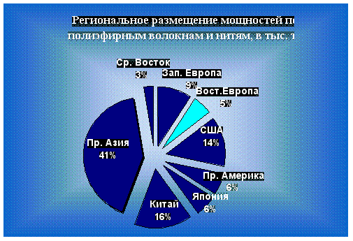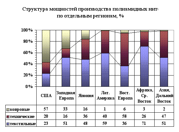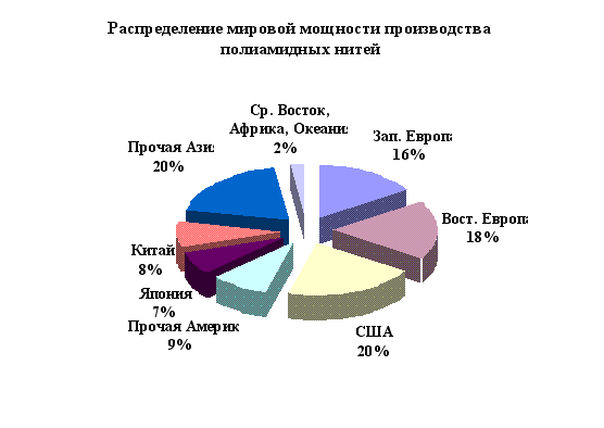 можна использовать только для дополнительной загрузки мощности ОАО "ЖЗХВ". 3.3.Полиамидные волокна и нитиВ общем мировом объёме химических волокон занимают вторую позицию и хотя увеличение выпуска незначительное, но всё же 17,9% мирового объёма говорит о хороших характеристиках (широком спектре применения) этих волокон. Эксперты прогнозировали выпуск полиамидных волокон в 2000 г. на уровне 5 млн. тонн, недооценивая степень конкуренции с полиэфирными волокнами на рынке одежды и ряде областей технического назначения. Однако этот вид волокон давно пользуется хорошим спросом для производства чулочно-носочных изделий, ковров, шинного корда. В соответствии с направлениями использования полиамидная продукция выпускается в виде штапельного волокна (17,5 – 18,5 % от общего выпуска) и нитей (текстильных, ковровых, технических). В мировом производстве нитей соотношение текстильных, ковровых и технических в настоящее время составляет 45:25:30 (в 1985 году оно было 60:20:20). Мощности по полиамидным нитям в мире составляют в настоящее время 4,75 млн. тонн, и регионально размещены в следующем соотношении (рис.3.10):