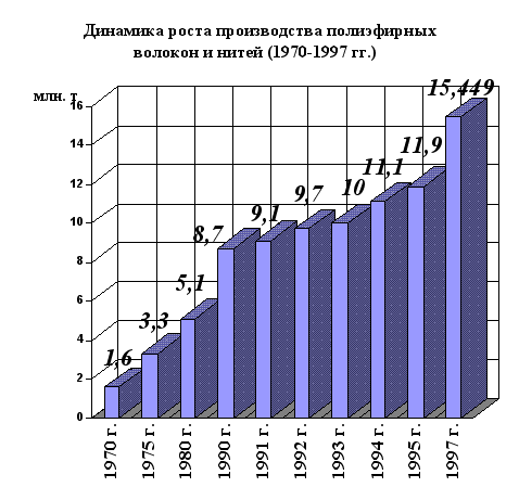 3.1.Полиэфирные волокна и нити Среди всех видов химических волокон и нитей полиэфиры развиваются самыми высокими темпами. Если в 1970 году их доля в общем выпуске составляла 35%, то по прогнозам специалистов доля этого вида волокна к 2000 г. возрастёт до 50% от общего мирового производства химических волокон. Анализ информации по мировому рынку за период 1975 – 1985 гг. показал, что ни один прогноз того времени не предполагал такого бурного развития полиэфирных волокон. Рост спроса на полиэфирные волокна был вызван, в первую очередь, более низкой ценой по сравнению с другими видами химволокон. Полиэфирные волокна оказались менее энергоёмкими и трудоёмкими. По имеющимся оценкам расход нефти в качестве сырьевых и энергетических ресурсов для производства 1т. синтетических волокон составляет: полиакрилонитрильных – 6,9 т., полиамидных – 5,5 т., а полиэфирных только 3,75 т. Кроме того, популярность полиэфирных волокон объясняется ещё и широким спектром применения из-за прекрасных свойств этих волокон. Они выпускаются в виде гладких комплексных и текстурированных нитей для изготовления тканей и трикотажа, штапельных волокон хлопкового и шерстяного типа, коврового жгута. Постоянно расширяется, изменяется структура потребления, появляется много новых, преимущественно на основе физически и химически модифицированного полиэтилентерефталата, волокон и нитей – с пониженной линейной плотностью, разноусадочные, ворсовые, комбинированные, бикомпонентные комплексные и текстурированные нити, анионно-модифицированные волокна шерстяного типа (обладают повышенной способностью к накрашиванию), отбеленные в массе волокна хлопкового типа, с постоянным антистатическим эффектом, огнестойкие и низкоплавкие (пригодные для склеивания волокнистых материалов) волокна и нити и др. Недостатком полиэфирных волокон, как впрочем, и других синтетических является плохая смачиваемость водой, из-за чего влага трудно проникает из-под одежного пространства во внешнюю среду, в результате чего происходит перегрев тела и, как следствие, появляется дискомфорт. Поэтому применение полиэфирных волокон в производстве нательной одежды ограничено. Выше приводился прогноз о динамике мирового производства химических волокон до 2000 г., однако ещё к концу 1997 г. мировая мощность по полиэфирным волокнам превысила 15 млн. тонн. За 27 лет выпуск полиэфирных нитей и волокон увеличился в 9,65 раз (это видно из диаграммы на рис3.6):