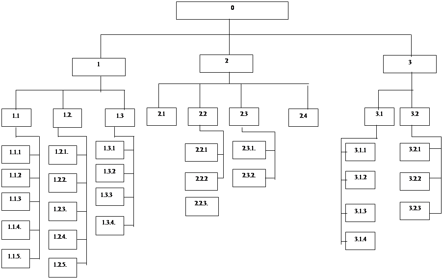 Дерево целей ООО ПК «Витязь» строится по принципу детализации целей организации на каждом последующем уровне. 0. Создание коммерческого предприятия выпускающего продукцию высокого качества. 1. Подготовительный этап 1.1 Организационно правовая форма предприятия 1.1.1 Выбор формы 1.1.2 Устав организации 1.1.3.Учредительный договор 1.1.4. Регистрация предприятия 1.1.5. Открытие расчетного и валютного счетов 1.2 Создание материально-технической базы предприятия 1.2.1 Выбор технологии 1.2.2. Закупка оборудования 1.2.3. Материальная база организации 1.2.4. Производственные площади 1.2.5. Определение общих потребных инвестиций на МТБ