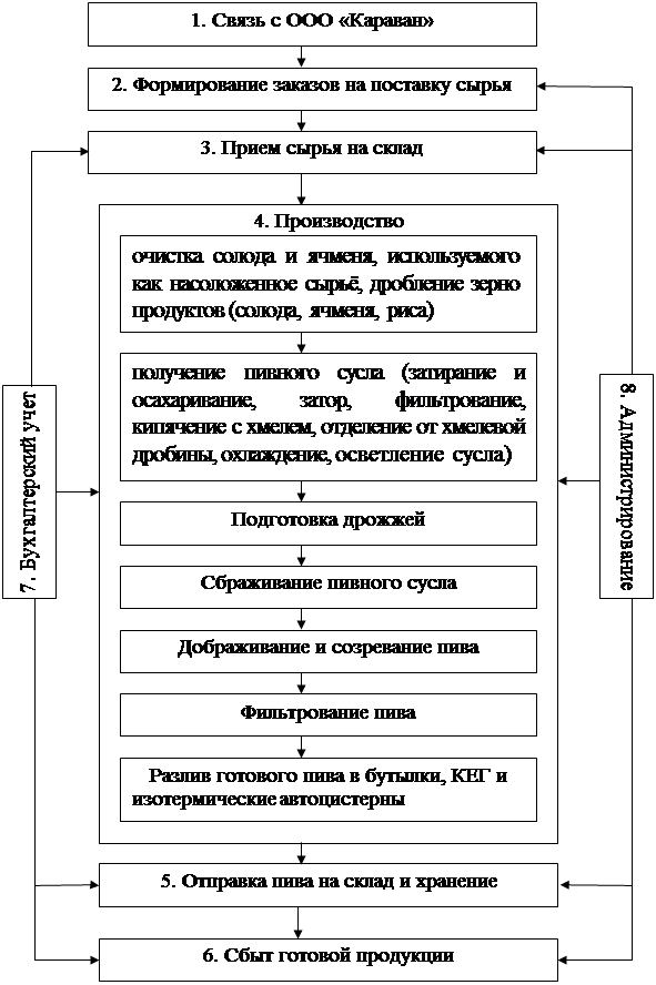 5.2. Описание полного производственного процесса 1. Связь с ООО «Караван» Для приготовления высококачественного продукта требуется хорошее сырье (солод, хмель, ячмень, дрожжи), которое поступает на ПК «Витязь» от ООО «Караван». Этим вопросом занимается начальник отдела снабжения, который ведет переговоры на поставку сырья, 2.Формирование заказа на поставку сырья Далее инженер отдела снабжения определяет общую текущую потребность в оборотных средствах, а также необходимый резерв, и формирует заказ на поставку сырья. 3.Приём сырья на склад Приём сырья на склад осуществляет по накладным заведующий складом. Далее при помощи автопогрузчиков производятся работы по разгрузке сырья и размещение его по специальным помещениям склада. Так, например, хмель хранится в помещении, оборудованном двумя воздухоохладителями для поддержания требуемой температуры. 4.Производство Производство солода включает очистку и сортировку ячменя, замачивание его до влажности 42-43%, доувлажнение на грядках до 43-45%, проращивание 8 суток и сушку солода до влажности 2-3.5%. Соложение ячменя ведется при температуре от 12 до 14°С до тех пор, пока внутренняя часть зерна не станет рыхлой и мучнистой, корешки проращенного зерна не достигнут длины, превышающей в 1,5-2 раза длину зерна. Солод сушат в сушилках, имеющих хорошую вентиляцию, с постепенным повышением температуры от 20 до 85°С для сортов светлого пива, до 105° - для сортов темного пива в течение 24 часов. Производство солода преследует цель разрыхлить зерно, изменить биохимический состав его и накопить в зерне большое количество ферментов, благодаря которым на последующих операциях из крахмала зерна получается сахар, из белка - аминокислоты, а при сушке солода образуются ароматические вещества и сохраняются ферменты в активном состоянии. Для приготовления солода употребляют зерно двухрядных и шестирядных ячменей, обладающее высокой прорастаемостью - не ниже 95 %. Для солода предпочтительно отбирают крупное выровненное зерно с содержанием белка от 9 до 14 % в тонкой мякинной оболочкой. Такое зерно легко солодится, дает солод с высокой ферментативной активностью и позволяет получить большой выход хорошего пивного сусла. Отлежавшийся после сушки солод посредством шнеков и нории НЦГ поступает на магнитную течку для очистки от металлической пыли и другой примеси. Очищенный солод шнеком d=300 мм подаётся в солодовый бункер V=11,5 м3 . Из бункера норией НЦГ –2 солод подаётся на 2 четырёхвальцевые дробилки БДА – 1м, которые снабжены промежуточным бункером и автоматическими весами Д-20. Указанные дробилки обеспечивают помол : шелуха 20%, мука 20-30%, мелкая и крупная крупка 50-60%. Дроблёный солод поступает в бункерное отделение на 4 этаже в бункер для измельчённого солода V=9,5 м3 . Подготовка ячменя, применяемого в качестве насоложенного материала, осуществляется по 2 веткам. Из силоса для хранения ячмень с помощью ленточных транспортёров поступает на сдвоенную норию НЦГ 100-2. С её помощью ячмень транспортируется на 7-й этаж норийной вышки, где установлены ячменные весы Д-100. Взвешенный ячмень по трубопроводу d=200 мм самотёком поступает на ячменный шнек d = 300 мм и передаётся в дробильное отделение в ячменный бункер V=5,1 м3. Далее ячмень самотёком поступает на молотковую ячменную дробилку ДДМ, откуда в измельчённом виде самотёком направляется 