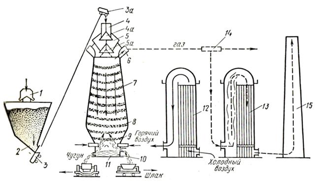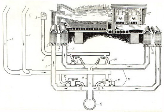 Рис. 1. Схема работы доменного цеха После загрузки очередной порции шихты приёмная воронка с малым конусом поворачивается на 60˚, что позволяет равномерно распределить шихту 7 на поверхности большого конуса перед опусканием её в печь. Маневрирование большим и малыми конусами в загрузочном аппарате доменной печи производится независимо друг от друга. Для достижения высоких температур и форсирования плавки шихты в печь подают горячий воздух 6 (дутьё). Холодный воздух из воздуходувки пропускают через нагретую до 1000 ― 1200˚С насадку воздухонагревателя 12. В результате воздух нагревается до 780 ― 950˚С. Пока один воздухонагреватель 12 отдаёт тепло кладки холодному воздуху (и в результате остывает), второй воздухонагреватель 13 нагревается до температуры 1200˚С, т. е. регенерирует тепло выделяющееся при сжигании доменного газа, предварительно очищённого то пыли в газоочистителе 14; продукты горения удаляются в дымовую трубу 15. После остывания насадки воздухонагревателя 12 и достаточного нагрева насадки воздухонагревателя 13 производят перекидку клапанов; холодный воздух направляется в воздухонагреватель 13, а воздухонагреватель 12 нагревается. Обычно воздухонагреватель работает на нагрев дутья около 1ч и на разогрев огнеупорной насадки около 2 ч. Поэтому для бесперебойного обслуживания печи необходимо иметь три воздухонагревателя. Через шлаковую летку 10 удаляется шлак, а через летку 11 ― чугун. 2. 1. 4. Продукты доменного производства Современная доменная печь поглощает большое количество шихтовых материалов и воздуха. Так, для производства каждых 100 т передельного чугуна необходимо в среднем подать в печь 190 т железной руды (включая агломерат), 95 т кокса, 50 т известняка и около 350 т воздуха. В результате кроме 100 т чугуна получается около 80 т шлака и 500 т доменного газа. В доменных печах выплавляют: 1. Передельный чугун (80 ― 90 % всего производства чугуна); 2. Литейный чугун (8 ― 17 %); 3. Специальные чугуны, или доменные ферросплавы (2 ― 3 %). Состав шлака зависит от состава шихты и марки чугуна. После доменной печи, чугун попадает в сталеплавильный цех. 2. 2. Производство стали В настоящее время сталь производят в трёх типах плавильных агрегатов ― конверторах, мартеновских и электрических печах. В качестве металлических шихтовых материалов используют: жидкий чугун и стальной лом (в конверторах); жидкий и твёрдый чугун со стальным ломом в мартеновских и электрических печах и иногда один стальной лом (в электрических печах). Кроме того, в состав шихты входят известь и другие шлакообразующие вещества, раскислители, железная руда и легирующие добавки. Для изготовления нашей детали, используется сталь, выплавленная в мартеновской печи. 2. 2. 1. Мартеновское производство стали Газ и воздух по каналам 1 и 2 подводят к газовому клапану 10, а затем смесь по каналу 5 поступает в регенератор 6. Вентилятором 3 по каналу 4 воздух подводится к воздушному клапану 9, от которого по каналу 8 поступает в регенератор 7. Насадка регенераторов, нагревается до 1500 ― 1550˚С, отдаёт тепло проходящим через них газу и воздуху. Нагреваясь в регенераторах до 1200˚С, газ и воздух по вертикальным каналам поступают в головки печи для образования газовоздушной смеси, которая и сгорает в рабочем пространстве. Продукты горения из рабочего пространства печи через правые головки направляются в регене