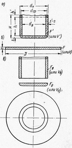 Рис. 4. Схема разбивки цилиндрического изделия на элементы при расчёте размеров заготовки: а ― изделие; б ― заготовка; в ― элементы изделия При вытяжке полого цилиндра, у которого дно и боковые стенки имеют различную толщину и условно сопряжены под прямым углом (рис. 4, при s’ < s), исходя из условия равенства объёмов V’ = V, имеем