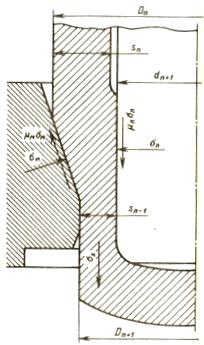 Рис. 5. Штамп для вытяжки листового металла Радиус закругления рабочей грани матрицы 3 обеспечивает плавность превращения круглой листовой заготовки в колпачок. При вытяжке изделий пуансоном 1 плоская часть заготовки (фланец) может свёртываться с образованием складок. Для предотвращения этого явления применяют прижимы 2. При вытяжки за один проход можно получить колпачок диаметром в 1,8 ― 2 раза меньше диаметра исходной заготовки. При большей деформации усилие вытяжки возрастает настолько, что металл разрушается (отрывается дно колпачка). Дальнейшее уменьшение диаметра колпачка достигается последующими вытяжками (рис. 5, б). При холодной листовой штамповке толщина обрабатываемого металла практически остаётся почти неизменной. Исключение составляют вытяжки с большими степенями деформации. В этом случае толщина колпачка около дна уменьшается примерно на 20 ― 30 % толщины заготовки. Зазор между пуансоном и матрицей должен быть равен величине, большей на 10 % толщины заготовки. При штамповке с утонением стенок зазор между пуансоном и матрицей меньше толщины листа. Для холодной листовой штамповки применяют кривошипные прессы, гидравлические прессы, пневматические прессы, а также пресс-автоматы. 2. 5. 5. Вытяжка с утонением (протяжка) Вытяжку с утонением применяют при изготовлении цилиндрических деталей глубиной до 10 диаметров. Этот способ позволяет получить детали, имеющие относительно точные размеры и высокие прочностные свойства. Возможность формоизменения за одну операцию ограничены разрушением стенки по выходе из матрицы, требуемой точностью полуфабрикатов, работоспособностью смазочного покрытия, тепловыделением в очаге деформации и другими факторами. Формоизменение заготовки При вытяжке с утонением в матрицу диаметром Dn+1 устанавливают полую заготовку диаметром Dn. Пуансон диаметром dn+1 входит в заготовку толщиной sn с небольшим зазором и в процессе выполнения операции проталкивает её через одну или несколько (от двух до пяти) матриц, расположенных одна под другой соосно с пуансоном. Диаметры последовательно уменьшающихся рабочих частей матриц меньше наружного диаметра заготовки. Соответственно уменьшающийся зазор между пуансоном и матрицей меньше толщины sn стенки заготовки. Следовательно, при вытяжке уменьшается как диаметр, так и толщина стенки и одновременно увеличивается длина вытягиваемой детали. Вытянутая таким образом деталь плотно прилегает к поверхности пуансона. При обратном ходе пуансона деталь упирается в выходной скат матрицы или съёмник и снимается с пуансона. Как видно из рис. 6, элементарные силы трения в очаге деформации между пуансоном μпσп и матрицей μмσм имеют различные направления. Поскольку заготовка смещается относительно матрицы в направлении движения пуансона,