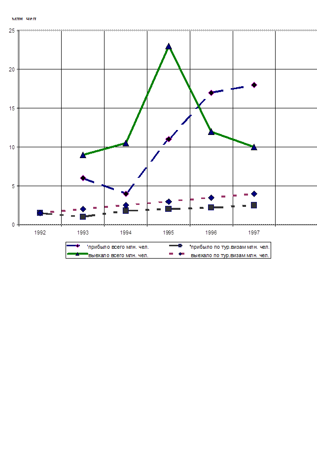 Новое социально- экономическое развитие России потребовало иного развития России. Последующая глава рассматривает состояние международного туризма на современном этапе, его положительное и недостаточное развитие согласно той классификации и понятиям о международном туризме, которые отражает первая глава. 2. Международный туризм России на современном этапе. 2.1Туристский потенциал России. Россия, обладая колоссальным туристским потенциалом, занимает сегодня скромное место на международном туристском рынке. На её долю приходится около 1% мирового туристского потока. Так, по данным Госкомстата России, в 1999 году выезжало за границу 11181,7 тыс. российских граждан, из них по туристским визам 4142,9 тыс. человек, в основном (9311,2 тыс. человек) в страны Дальнего зарубежья, включая страны Балтики. В том же году в Россию прибыло 17462,6 тыс. иностранных граждан, из них с целью туризма 2515,0 тыс. человек, что в 1,33 раза больше, чем в 1998 году. Основная доля туристского потока в Россию (около 72%) приходится на страны СНГ и Балтики. Дефицит платежного баланса по статье "Туризм" составил в 1994 году около 5 млрд. долларов. Материальная база туризма более чем на 80% нуждается в реконструкции. Ощущается острый дефицит квалифицированных специалистов по туризму. Такое положение объясняется неустойчивой экономической ситуацией в стране, снижением уровня жизни и резким усилением дифференциации доходов населения, а также криминогенной ситуацией в ряде регионов, не способствующей увеличению туристов в Россию. В 1997 году из России с туристскими целями выехало в 1,7 раза больше туристов, чем прибыло. (График 1.) 2.2.Виды туристской деятельности на современном этапе развития туризма в России. Развитие предоставления услуг по туризму на мировом рынке идет по линии увеличения. Особое значение придается на современном этапе среде проживания, питания. Основными условиями маркетинга обслуживания являются: учет местных условий, определение политики продаж и обслуживания, выработка стратегии управления доходами, система постоянного улучшения обслуживания, разработка ценовой политики. В последнее время в мире получило распространение и некоммерческое распределение – проживание у родственников, друзей, знакомых. График № 1.* Динамика прибытий граждан в Россию и ВЫездов граждан из России в 1993 – 1997 гг.