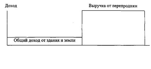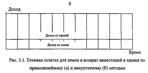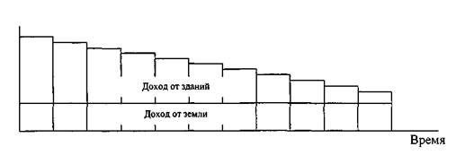 * С учетом затрат на строительство в 450000 долл. полезной жизни зданий в 50 лет и равномерных доходов в основу расчета ежегодного дохода положен фактор взноса на амортизацию единицы при соответствующей ставке процента. Применяемый метод капитализации должен соответствовать характеру прогнозируемого дохода. Если подобного соответствия между допущениями о потоке доходов и ставками капитализации не будет достигнуто, то полученные в результате расчетов величины текущей стоимости будут неверны. Динамика доходов от здания и земли, соответствующая каждому из двух различных допущений возмещения капитала, показана на рис. 3.1. Следует обратить внимание на то, что допущение о возмещении капитала очень сильно влияет на остаточный доход и величину стоимости.