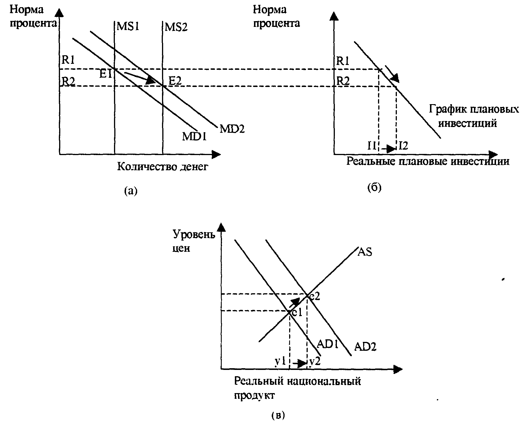 Рис.2 Модели воздействия одномоментного изменения количества денег следовательно, равновесное значение номинальной нормы процента равно R1. При этом значении будут осуществлены реальные плановые инвестиции в объеме, обозначенном в части (б) рисунка символом П. Данный уровень плановых инвестиций учитывается в качестве структурообразующего элемента при построении кривой совокупного спроса AD1 в части (в). Таким образом в точке е1 в которой пересекаются кривые совокупного спроса AD1 и совокупного предложения AS, является точкой первоначального равновесия экономической системы. Уровень равновесия реального объема производства обозначен yl, a P1 соответствует равновесному уровню цен. Предположим, что государство увеличивает количество денег в обращении. Графически это представлено в части (а) рисунка 2 как некоторый сдвиг кривой предложения денег вправо в положение MS2. Указанный сдвиг совершается путем введения в банковскую систему дополнительного количества резервов через осуществление покупок ценных бумаг на открытом рынке. Поскольку банки, стремясь привести в движение свои дополнительные резервы, вступают в конкурентную борьбу, норма процента падает. Падающая норма процента уменьшает альтернативную стоимость инвестиций. Фирмы реагитруют на это, перемещаясь вправо, вниз вдоль графика плановых инвестиций в части (б) рисунка. Из за этих изменений происходит рост совокупных доходов. Прирост объема реальных плановых инвестиций в свою очередь, заставляет сдвинуться вправо кривую совокупного спроса, как это показано в части (в). В ответ на повышение спроса происходит как повышение реального объема производства, так и рост цен. При этом экономическая система на краткосрочных временных интервалах перемещается вдоль кривой совокупного предложения вправо, вверх. Повышение уровня цен и увеличение реального объема производства заставляет расти величину номинального реального дохода. Возвращаясь к исходной точке этих рассуждений отметим, что рост номинального национального дохода приводит в движение силы спроса на рынке денег и вызывает сдвиг кривой спроса на деньги вправо из положения MD 1 в положение MD2. Этот сдвиг достаточен для того, чтобы ограничить падение нормы процента, но недостаточен, чтобы избежать его полностью. В данном состоянии равновесия на краткосрочном временном интервале значение нормы процента ниже, а реальный объем инвестиций, реальный объем производства и уровень цен выше, чем они были первоначально. Монетаристы в отличие от кейнсианцев выдвигают политику денежно-кредитного регулирования на первый план. Они утверждали, что этот процесс характеризует зависимость между изменениями объема денежной массы. совокупного спроса и совокупного дохода. Основные действия в теории монетаристов были направлены на подавление действий инфляционных процессов в экономике. Для этого государство должно ограничивать прирост денежной массы в обращении. Основанием такова утверждения была формула Фридмена: Среднегодовой прирост денежной массы = среднегодовой прирост совокупного дохода + среднегодовой прирост ожидаемой инфляции Фридменом также было сформулировано основное правило монетарной политики: государство должно обеспечить стабильный рост денежной массы в обращении в течение долгосрочной периода време