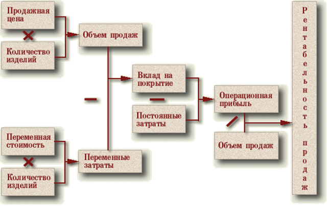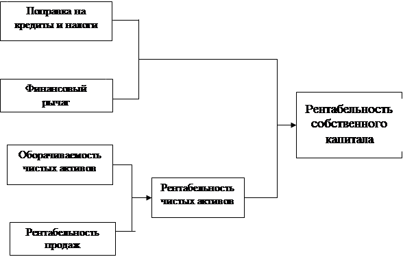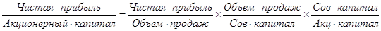 (Операционная прибыль / Объем продаж) * (Объем продаж/Чистые активы) = (Операционная прибыль / Чистые активы) Рентабельность чистых активов используется при оценке эффективности финансового рычага Финансовый рычаг- соотношение собственных и заемных средств в структуре чистых активов характеризует влияние кредитования на эффективность деятельности предприятия. Основной критерий оценки эффективности финансового рычага - ставка банковского кредита. Если кредитная ставка ниже показателя рентабельности чистых активов, то увеличение доли кредитов повысит значение рентабельности собственного капитала, и наоборот. Значение финансового рычага показывает на сколько увеличится / уменьшится значение рентабельности собственного капитала при увеличении / уменьшении рентабельности чистых активов. Финансовый рычаг рассчитывается по следующей формуле:= Чистые активы / Собственный капитал Используя приведенные выше показатели мы можем получить следующую формулу: Рентабельность продаж * Оборачиваемость чистых активов * Финансовый рычаг = (Операционный доход / Объем продаж)* (Объем продаж /Чистые активы) * (Чистые активы / Собственный капитал) = (Операционный доход/ Собственный капитал) Теперь для получения окончательной формулы рентабельности собственного капитала необходимо ввести поправку, чтобы в числители фигурировала чистая прибыль. (Операционный доход/ Собственный капитал)* (((ОД-I)*(I-Т))/ОД)=Рентабельность собственного капитала, где, ОД - операционный доход; I - сумма процентов по кредитам; Т - ставка налога на прибыль Это значение отличается от полученного ранее, так как здесь не учитывается некоторые, так называемые нерегулярные статьи доходов и затрат из отчета о прибылях и убытках. Схематично формирование показателя рентабельности собственного капитала показано-