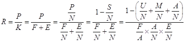 где R - рентабельность активов (капитала); Р - прибыль от реализации; К - средняя за период стоимость активов; F - средняя за период стоимость вне оборотных активов; Е — средние остатки оборотных активов;
