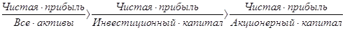 Несовпадение уровней и рентабельности по этим показателям характеризует степень использования предприятием финансовых рычагов для повышения доходности: долгосрочных кредитов и других заемных средств, Данные показатели специфичны тем, что отвечают интересам все участников бизнеса предприятия. Например, администрацию рацию предприятия интересует отдача (доходность) всех активов (всего капитала); потенциальных инвесторов и кредиторов - отдача на инвестируемый капитал; собственников и учредителей -доходность акции и т.д. Каждый из перечисленных показателей легко моделируется по факторным зависимостям Рассмотрим следующую очевидную зависимость:
