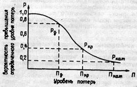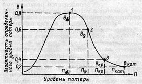 Рис.3 Кривая вероятности определенного уровня потерь При построении кривой распределения вероятностей потерь сделаем следующие предположения: вероятность нулевых потерь практически равна нулю, так как какие-то минимальные потери всегда имеют место; вероятность исключительно больших потерь практически равна нулю, так как потери заведомо имеют верхний предел; существует конечная, меньше единицы максимальная вероятность определенного уровня потерь, и вполне возможно предположить, что какой-то уровень потерь окажется наиболее вероятным; вероятность потерь изменяется в зависимости от их уровня непрерывным образом, монотонно возрастая от нуля до максимального значения и монотонно убывая от максимального значения до нуля по мере увеличения уровня возможных потерь. На изображенной кривой распределения вероятностей выделим четыре характерные точки. Первая из них соответствует вероятности возникновения потерь Вв, величина которых равна Пв. Вторая точка соответствует вероятности допустимого риска Вд , при котором потери будут иметь величину Пд , равную ожидаемой прибыли П. Это вероятность допустимой потери. Третья точка соответствует вероятности критического риска Вкр, при котором возможны потери в сумме выручки. Вероятность таких потерь, равную Вкр, назовем вероятностью критической потери. Четвертая точка характеризует вероятность катастрофического риска, т. е. вероятность потерь Вкат, равных всему состоянию предпринимателя. Если при оценке риска удается определить четыре характерные точки, то задачу оценки риска можно считать успешно решенной. При принятии решения о допустимости и целесообразности предпринимательского риска важно знать не только вероятность определенного уровня потерь, но и вероятность того, что потери будут больше некоторого уровня. По логике это и есть основной показатель риска, поэтому важно знать кривую или хотя бы важнейшие характеристики кривой вероятности превышения определенного уровня потерь, которая имеет следующий вид (рис.4). Оценка риска зависит от индивидуального восприятия человека.