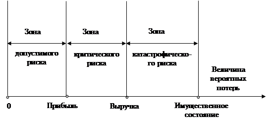 Рис.2 Схема зон риска Обычно подобная ситуация имеет место, если товар не продается либо частично или полностью погибает. Предприниматель в этом случае несет прямые убытки, его вложения в дело, затраты становятся бесплодными. Естественно, что предприниматель должен избегать проектов, операций, в которых есть ощутимая вероятность попадания в зону критического риска. Еще более устрашающим является катастрофический риск. Будем называть риск катастрофическим, если ожидаемые, вероятные потери способны превзойти ожидаемую выручку от операции и достичь величины, равной всему имущественному состоянию предпринимателя, всем имеющимся у него средствам. Реально это означает, что предприниматель теряет не только средства, вложенные в операцию, но и многое сверх того. Каждому из предложенных качественных определений категорий риска соответствуют характеризующие его количественные параметры. Такими показателями могут быть либо вероятность определенного уровня потерь, либо вероятность того, что потери окажутся выше определенного уровня. Рассмотрим оба подхода более детально.