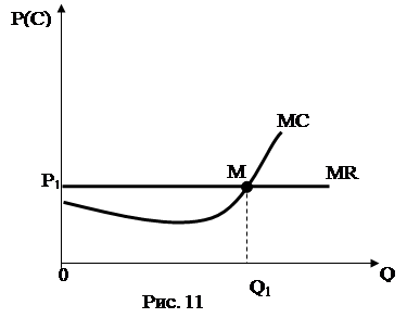 Вместе с тем, производство дополнительной единицы продукции, порождая дополнительные издержки, с другой стороны, приносит и дополнительный доход, выручку от ее продажи. Величина этого дополнительного, или предельного дохода представляет собой разность между выручкой от продажи n и п- 1 единиц продукции: MR=TRn— TRn-1. В условиях свободной конкуренции, как известно, производитель не может повлиять на уровень рыночной цены и, следовательно, продает любое количество своей продукции по одной и той же цене. Это значит, что в условиях свободной конкуренции дополнительный доход от продажи дополнительной единицы продукции будет при любом объеме производства одинаков, т.е. предельный доход будет равен цене: MR=P. Введя понятия предельных издержек и предельного дохода, можем теперь гораздо более точно определить точку равновесия фирмы, или точку, где она прекращает производство, добившись максимально возможной при данной цене массы прибыли. Очевидно, что фирма будет расширять объем производства, пока каждая дополнительно произведенная единица продукции будет приносить дополнительную прибыль. Другими словами, пока предельные издержки будут меньше, чем предельный доход, фирма может расширять производство. Если предельные издержки начнут превышать предельный доход, фирма будет нести убытки. На рис. 11 показано, что с увеличением производства кривая предельных издержек (МС) идет вверх и пересекает горизонтальную линию предельного дохода, равного рыночной цене Р1, в точке М, соответствующей объему производства Q1. Любое отклонение от этой точки приводит к потерям для фирмы либо в виде прямых убытков при большем объеме производства, либо в результате сокращения массы прибыли при уменьшении выпуска продукции.