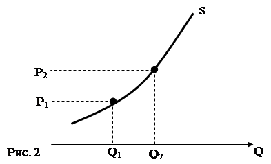 Кривую d в экономической литературе называют кривой спроса. Проецируя на нее цены, можно определить как изменится величина спроса при изменении цены. Если при цене P1 величина спроса составляет Q1, то при снижении цены до P2 величина спроса увеличится до Q2 и т.д. Полученная кривая иллюстрирует закон постепенного убывания спроса, который можно сформулировать следующим образом: если цена какого-либо товара повышается (и при этом все другие условия остаются неизменными), то спрос будет предъявляется на меньшее количество товара. Та же зависимость может быть может быть сформулирована иначе: если на рынок поступает большее количество какого-либо товара, то, при прочих равных условиях, он может быть реализован по менее высокой цене. Закон постепенного убывания спроса в отношении практически всех товаров. Причины этого нетрудно определить: они связаны, прежде всего, с ограниченностью доходов покупателей. Если при высокой цене на товар его могут покупать лишь богатые люди, то понижение цены, во-первых, приносит новых покупателей. Во-вторых , каждое понижение цены может побудить каждого потребителя данного товара совершить дополнительные покупки, пока потребность в нем не удовлетворена полностью. Следует отметить, что даже после того, как рост спроса данного потребителя фактически приостановился, при дальнейшем понижении цены сумма покупок на рынке будет увеличиваться в связи с тем, что более низким уровнем дохода начнут удовлетворять свои потребности. Если теперь рассмотрим рыночную ситуацию со стороны продавцов, или со стороны предложения, то заметим обратную картину. Все продавцы будут стремиться получить на рынке самую высокую цену, и чем выше будет цена, тем активнее они будут пытаться продать большее количество товара, т.е. увеличить предложение.