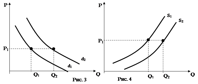 Тенденция к увеличению производства при высоких ценах объясняется тем, что, с одной стороны, повышение цены привлекает в данную отрасль новых производителей. С другой стороны, при росте цен предприниматель получает добавочную прибыль и имеет возможность нанять больше рабочих, купить больше сырья и машин, расширить производство. Вместе с тем, следует иметь в виду, что речь идет лишь о тенденции к увеличению предложения. До известного предела рост цен вызывает рост предложения. Однако, если рост цен продолжается, то производитель может снизить объем производства. Это объясняется, с одной стороны, тем, что высокий уровень дохода в известной мере снижает стимулы к продолжению интенсивной работы. С другой стороны, производитель может опасаться, что при дальнейшем наращивании объемов производства произойдет затоваривание и цены начнут снижаться. Для каждого товара существуют свои кривые спроса и предложения. Однако было бы неправильно представлять их как раз и навсегда данные. Под воздействием ряда факторов кривые спроса и предложения могут смещаться. В этой связи важно различать величину спроса и сам спрос. При снижении цены увеличивается величина спроса, но сам спрос как выражение потребности в данном товаре остается неизменным. Можно говорить об увеличении спроса, если при каждой цене (и высокой, и низкой) покупатели будут приобретать большее количество данного товара. Так, в жаркие летние месяцы возрастает спрос на прохладительные напитки и мороженое. В этом случае будем двигаться не по кривой d1, а произойдет сдвиг кривой в новое положение d2 (рис. 3). Кроме того, следует отметить, что на величину спроса кроме цены влияют уровень доходов, размер рынка, цена и полезность других товаров, особенно товаров-заменителей (субститутов), субъективные вкусы и предпочтения, мода и т.п. Если, например, средний доход покупателей возрастет, то при прочих равных условиях кривая спроса d1 сместится вправо вверх (рис. 3) и тому же уровню цены Р1 будет соответствовать возросший уровень спроса Q2. Главный фактор, воздействующий на предложение,— издержки производства. Поэтому если в результате использования достижений технического прогресса или, применительно к сельскому хозяйству, в силу благоприятных погодных условий удается снизить издержки производства, кривая предложения S1 смещается вправо вниз (рис. 4).