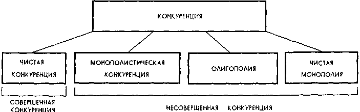 В Рис. 4. Типы конкуренции Чистую, или свободную, конкуренцию принято еще называть совершенной конкуренцией, а три других типа — объединять названием несовершенная конкуренция. Чистая конкуренция представляет собой рыночную ситуацию, когда многочисленные, независимо действующие производители продают идентичную (стандартизированную) продукцию, и ни один из них не в состоянии контролировать рыночную цену. Таким идентичным, или стандартизированным, товаром может быть, например, пшеница, кукуруза, сахар, акции компании. Каждый из продавцов при этом не в состоянии повлиять на цену товара, складывающуюся на рынке. Продавец на таком рынке является "ценополучателем". Выделим основные характеристики чистой конкуренции: а) многочисленность участников обмена — продавцов и покупателей; б) тождественная, стандартизированная продукция; в) свободный доступ к рынкам новых продавцов и возможность такого же свободного выхода с них; г) наличие полной информации у участников обмена. Покупатели должны иметь сведения об имеющихся продавцах, их ценах, других условиях реализации. Экономические субъекты должны располагать примерно одинаковым объемом информации о рынке. Эти условия в большинстве случаев сегодня являются трудноосуществимыми. Поэтому чистая, или совершенная, конкуренция — это редкостный тип конкуренции в современной экономике. Преобладают формы несовершенной конкуренции, где продавцы обладают определенным контролем над рыночной ценой. Монополистическая конкуренция — это такая рыночная ситуация, когда многочисленные продавцы продают схожие товары, стремясь придать им реальные или мнимые уникальные качества. Примеры такой конкуренции следующие: "жевательная резинка, очищающая зубы", "журнал для деловой женщины", "автомобиль для тропиков", "свежий хлеб", "шампунь, укрепляющий корни волос”. К основным характеристикам монополистической конкуренции можно отнести: а) относительно большое число некрупных производителей; б) продажа схожей, но не идентичной продукции. Разные производители занимаются созданием разновидностей товара, удовлетворяющих в принципе одну и ту же потребность. Но назвать уже их продукцию идентичной нельзя. Здесь наблюдается дифференциация продукта; в) наличие у отдельного производителя очень ограниченного контроля над рыночной ценой. Это связано, во-первых, с тем, что производителей достаточно много, значит доля предлагаемого товара, приходящаяся на одного, — относительно небольшая. Во-вторых, спрос на такую продукцию характеризуется довольно высокой степенью эластичности: покупатели чутко реагируют на изменение цены, и в случае ее повышения могут переключиться на приобретение схожей продукции у других продавцов, проигнорировав какие-то особенности в свойствах товаров. Соперничающие субъекты могут использовать здесь как ценовые, так и неценовые методы конкуренции. Возможность применения последних, в отличие от условий чистой конкуренции, связана с дифференциацией продукта: конкуренты предлагают его разновидности, стремясь убедить покупателя в превосходстве своих спецификаций товара. И поэтому здесь являются достижимыми конкурентные преимущества в результате совершенствования качества продукта, условий его продажи, дизайна, упаковки, активной рекламы и т. д.; г) различные соглашения меж