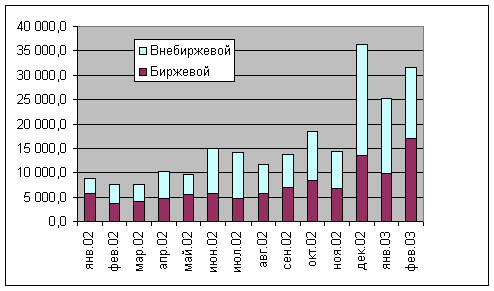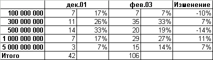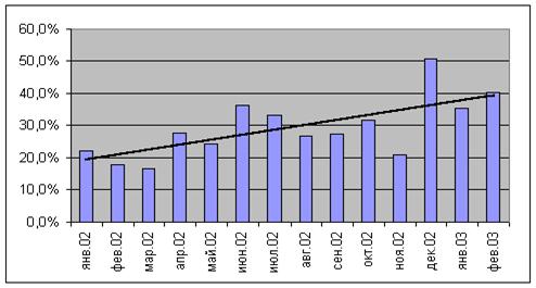 Важно то, темп его роста превышает темп роста первичного рынка, т.е. ликвидность бумаг на вторичном рынке возрастает. Это можно измерить т.н. показателем оборачиваемости, т.е. отношением оборотов на вторичном рынке за некоторый период (напр., месяц) к общему объему рынка. Данные по оборачиваемости показаны на диаграмме 5: Диаграмма 5: Оборачиваемость корпоративных облигаций на вторичном рынке. За период с начала 2002 года доходности корпоративных облигаций наиболее кредитоспособных эмитентов снизились с 18-20% до 12-14%. Доходности облигаций «второго эшелона» - с 20-23% до 14-16%. В 2001 и значительной степени 2002 году спрэд между доходностями большинства эмитентов был минимальным. В основном он составлял не более 3-4 процентных пунктов. В настоящее время спрэд заметно вырос, и составляет до 8-10 пп. В соответствии с этим, появилась возможность дифференцировать эмитентов по их уровню кредитного риска. Снижение ставок открыло путь на рынок более широкому кругу эмитентов, для которых ранее заимствования на рынке корпоративных облигаций были неприемлемо дорогими. В 2001 году в основном размещались облигации, предусматривающие возможность инвестора реализовать бумаги по оферте через 3-6 месяцев. В 2002 году срок до оферты вырос в среднем до 1 года, однако более длинных бумаг не размещалось. В 2003 году начались размещения более длинных бумаг: · МГТС – срок обращения 2 года · Внешторгбанк – срок обращения 3 года · ОМЗ – 1.5 года Связано это со следующими факторами: · снижение процентных ставок · расширение инвестиционного горизонта инвесторов · рост ликвидности на вторичном рынке. Это дает инвестором возможность продать большой объем облигаций, не дожидаясь срока оферты. Судя по объявляемым планам эмитентов, уже в ближайшее время от механизма оферт будут отказываться, и срок обращения облигаций вырастет до 2-5 лет. Проявляется тенденция к тому, что займы в среднем становятся крупнее. Растет доля займов с объемами от 500 млн. руб. до 1 млрд. рублей, и свыше 1 млрд. рублей. Снижается доля займов с объемами до 100 млн. рублей.