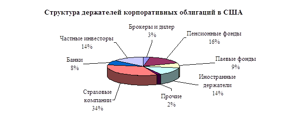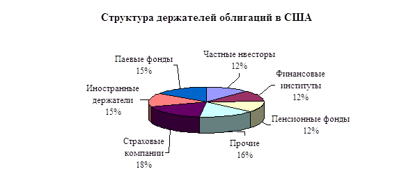 Диаграмма 2: Структура держателей корпоративных облигаций в США Похожей является и структура держателей облигаций в Японии, где частным лицам принадлежит около 22% облигаций, а остальное приходится на долю финансовых институтов. На Тайване доля частных инвесторов составляет 11%, а доля финансового сектора — 85%; в Корее на долю финансового сектора также приходится порядка 80% всех инвестиций в корпоративные облигации. Естественно, значимость той или иной группы инвесторов среди держателей облигаций различна в разных странах, хотя имеет место общая тенденция, состоящая в доминирующей роли финансового сектора, на долю которого приходится 70-80% всего объема инвестиций в корпоративные облигации. При этом среди инвесторов из финансового сектора значительную роль играют небанковские финансовые институты (инвестиционные фонды, страховые компании, пенсионные фонды). В странах, где эта группа финансовых институтов достаточно развита, они обычно опережают банки. Такая ситуация объясняется тем, что банковская деятельность состоит прежде всего в привлечении депозитов и выдаче кредитов и вложения в ценные бумаги в большинстве стран не являются существенной сферой банковской деятельности. Покупка корпоративной облигации во многом эквивалентна выдаче кредита. При этом, однако, выдача кредита обычно предпочтительна для банков, поскольку кредит в большинстве случаев выдается банками своим клиентам, с которыми у банков имеются длительные связи, и имеется возможность осуществлять мониторинг их деятельности. В отличие от банков другие группы финансовых институтов, такие как страховые компании и инвестиционные фонды, не имеют возможности заниматься прямым кредитованием. Более того, они не осуществляют расчетно-кассового обслуживания заемщиков и не имеют возможности осуществлять таким образом мониторинг их деятельности. Поэтому эти группы финансовых институтов в большей степени заинтересованы в приобретении облигаций, в том числе корпоративных, и именно страховые компании и инвестиционные фонды являются основными инвесторами на рынке облигаций. Все большую значимость в США и ряде других стран приобретают так называемые инвестиционные фонды. Идея деятельности инвестиционного фонда состоит в том, что фонд аккумулирует сбережения за счет выпуска своих ценных бумаг и вкладывает их в ценные бумаги, существующие на фондовом рынке. При этом инвестору, вложившему деньги в фонд, принадлежит как бы часть портфеля фонда. Инвестиционные фонды могут вкладывать средства или в конкретные виды ценных бумаг (например, только акции или только облигации), или в различные виды ценных бумаг. Наиболее активны на рынке облигаций специализированные фонды облигаций и сбалансированные фонды, инвестирующие часть активов в акции и часть — в облигации. На денежном рынке роль паевых фондов (так называемых взаимных фондов денежного рынка) в структуре держателей корпоративных долговых бумаг (коммерческих бумаг) еще выше. Частные инвесторы обычно менее активны на рынке облигаций, нежели на рынке акций. Сравнительно низкую значимость облигаций у частных инвесторов можно проиллюстрировать структурой вложений частных инвесторов в различные финансовые инструменты. В США облигации (государственные, муниципальные и корпоративные) занимали в 1998 году все