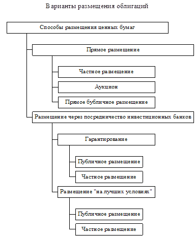 инвесторам подписаться Размещение на аукционе. Таким образом обычно проводится размещение государственных облигаций. Корпорации также могут проводить размещение в форме аукциона, однако реально это могут позволить себе только крупнейшие корпорации, ценные бумаги которых обычно уже хорошо известны на рынке. Часто таким образом происходит размещение коммерческих бумаг. Прямое публичное размещение. Данный тип размещения достаточно редко применяется, поскольку в этом случае эмитент фактически самостоятельно проводит работу, которую традиционно осуществляют инвестиционные банки. Прямое размещение сравнительно редко применяется при выпуске облигаций, хотя в некоторых случаях этот способ предпочтителен. Таким способом размещаются, в частности, коммерческие бумаги крупных компаний. В некоторых случаях крупные корпорации имеют в своей структуре специализированное финансовое подразделение, которое и осуществляет работу с ценными бумагами корпорации. Размещение через посредничество инвестиционных банков. Большинство крупных выпусков ценных бумаг, в том числе облигаций, обычно осуществляется с помощью инвестиционных банков, о которых уже шла речь выше. При этом роль инвестиционных банков в процессе размещения может быть различной, существуют две «крайние» формы размещения ценных бумаг — гарантированное размещение и размещение «на лучших условиях». Гарантированное размещение. В этом случае инвестиционные банки гарантируют размещение ценных бумаг по оговоренной цене. При этом инвестиционные банки могут либо полностью выкупить выпуск «на себя» и в дальнейшем проводить его продажу от своего имени, либо принять обязательство выкупить часть выпуска, которая не была размещена среди конечных инвесторов к заданному сроку. Обычно применяется именно первый вариант, т. е. выкуп ценных бумаг инвестиционными банками. Достоинство такой схемы для эмитента состоит в том, что он сразу же получает деньги и его уже не волнует то, что инвестиционные банки не смогут распродать выпуск. А вот для инвестиционных банков такой вариант размещения может быть сопряжен с существенным риском. Классическим примером такого риска служит размещение эмиссии облигаций IBM в октябре 1979 года на сумму 1 млрд. долл. За счет резкого роста процентных ставок на следующий день после подписания договора между IBM и синдикатом инвестиционных банков цена, по которой удалось разместить облигации, оказалась значительно ниже гарантированной цены, и инвестиционные банки понесли убытки порядка 20 млн. долл.. Размещение «на лучших условиях». В данном случае инвестиционные банки осуществляют содействие эмитенту в продвижении его ценных бумаг, но не гарантируют размещения выпуска. При этом инвестиционный банк действует фактически в качестве брокера. Размещение «на лучших условиях» применяется в мировой практике гораздо реже, чем гарантированное размещение, и обычно применяется при размещении ценных бумаг молодых компаний, мало известных на рынке. При этом размещением «на лучших условиях» могут заниматься небольшие инвестиционные банки, не имеющие возможности осуществлять гарантированные размещения. На практике могут существовать и промежуточные формы взаимодействия эмитента и инвестиционных банков. Например, может быть выдана гарантия на размещение 