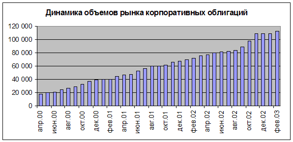 Таблица 3: Соотношение количества эмитентов. Как видно из таблицы, если по состоянию на конец 2001 года предприятия "второго эшелона" составляли около 1/3 всех эмитентов, то к февралю 2003 года их доля приблизилась к 1/2. Наблюдается тенденция увеличения количества эмитентов, не относящихся к числу крупнейших корпораций. Это не означает напрямую, что падает и надежность эмитентов. Тем не менее, определенная корелляция есть – у крупнейших корпораций ниже репутационные риски, да и характер их деятельности обычно подразумевает более высокую рентабельность и финансовую устойчивость. Вполне возможно, что эта тенденция роста доли предприятий «второго эшелона». В пользу этого свидетельствует ряд факторов. · Снижение процентных ставок по облигациям, делающих даже для низконадежных эмитентов эти ставки приемлемыми. · "Технология размещения", поставленная на поток, снижающая стоимость услуг посредников. ЗаключениеСовременную финансовую систему государства невозможно представить без развитого рынка ценных бумаг, а в частности без рынка корпоративных облигаций, которому посвящена данная дипломная работа. Рынок корпоративных облигаций в РФ сравнительно молодой. Фактически толчком к развитию данного рынка послужил «августовский» кризис 1998 года, когда в результате кризиса банковской системы предприятия лишились возможности для получения кредитов. Во всех развитых странах, с цивилизованным рынком корпоративных облигаций основное количество заемных средств для финансирования инвестиций, предприятия получают путем выпуска и размещения корпоративных облигаций. Это обусловлено тем, что банковская система не в состоянии предоставить значительные объемы денежных средств на длительный срок, а так же величиной процентных ставок. В Российской Федерации заимствования на рынке корпоративных облигаций пока не получило широкого распространения по ряду причин, в частности из-за несовершенства законодательства. На мой взгляд существует ряд мер для повышения эффективности рынка корпоративных облигаций, и активизации на нем деятельности эмитентов и инвесторов: 1. Значительное снижение либо отказ от налога на эмиссию ценных бумаг; 2. Приведение налогообложения по корпоративным облигациям в соответствие с налогообложением государственных ценных бумаг; 3. Упрощение процедуры выпуска корпоративных облигаций; 4. Отнесение на себестоимость затрат эмитента, связанных с подготовкой, эмиссией, размещением и обслуживанием ценных бумаг; 5. Внедрение национальной системы рейтингов, включая работу с ведущими рейтинговыми агентствами, формирующими приоритеты инвесторов; 6. Информационное освещение выпуска ценных бумаг новыми предприятиями, в первую очередь из научно-технической и информационной сфер. В заключении хочу добавить, что нельзя недооценивать значение рынка корпоративных облигаций для государства в целом, т.к. средства привлекаемые предприятиями направляются на модернизацию производства, а отлично функционирующие предприятие это огромные финансовые потоки в виде налоговых платежей в бюджет государства. Список использованной литературы1. Гражданский кодекс РФ. 2. Закон РФ «О рынке ценных бумаг» №39-ФЗ от 22.04 3. Закон РФ "Об акционерных обществах" N 208-ФЗ от 26.12.1995 г. 4. Закон РФ "Об обществах с ограниченной ответственностью" N 14-ФЗ от 8.02.199