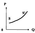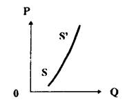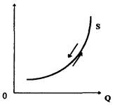 Рис. 3.4 Кривая предложенияФорма кривой предложения товара обусловлена во многом технологией его производства, доступностью ресурсов, Используемых при изготовлении данного товара. Если мобильность производства и используемых в нем ресурсов высока, то кривая предложения имеет более пологий вид, т.е. незначительное изменение цен означает существенное увеличение предложения товара. Когда же увеличение производства требует больших затрат ресурсов, кривая предложения более крутая. Кривая предложения строится при соблюдении ряда условий. => издержки производства известны, если они уменьшаются, производители согласны предложить то же количество товара, что и раньше, но по пониженным ценам, или больше — по текущим ценам; => цены на товары-заменители установлены; => предполагается, что изменение цены — единственно возможный путь. Если перечисленные условия меняются, то кривая предложения перемещается: рост предлагаемого количества товара по различным ценам вызывает ее перемещение вправо и вниз, его сокращение — вызывает перемещение этой кривой влево и вверх. Если условия постоянны, то изменение цены означает движение вдоль кривой предложения. Степень реакции предложения на колебания цен измеряется эластичностью предложения, которая представляет собой отношение изменения предложения в процентах к процентной величине колебания цен.