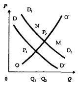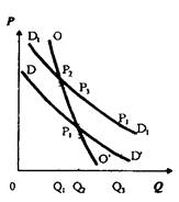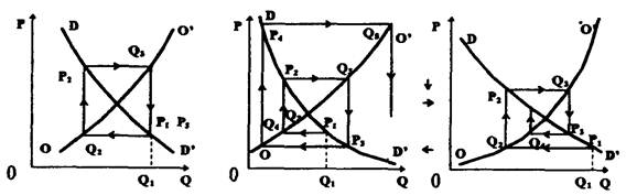 а) б) в) Рис. 3.7 Перемещение кривой спросаНа графике (рис. 3.7) кривая спроса перемещается от DD’ к положению D1D1’. При цене P1 спрос будет избыточным — P1M. P2 станет новой ценой, ведущей к равновесию. Процесс адаптации на рынке вызовет одновременно рост цен и увеличение количества товара. Это положение устойчивого равновесия. Как видно на рисунке, кривая предложения имеет позитивный наклон. Однако у кривой предложения возможны варианты негативного наклона. На Рис. 6.7,б кривая спроса перемещается из положения DD’ к положению D1D1’. Количество запрашиваемого товара по старой цене P1 равно OQ2, в то время как предлагаемое количество равно OQ1. Избыток спроса составляет Q1Q2. Новая цена (равновесная), будет равна Р2, что ниже, чем P1. Как видно из рисунка, избыток спроса не ликвидируется. Линии, отражающие состояние цен и объемы товара, перемещаются в сторону от этой точки. Возникает положение неустойчивого равновесия. На Рис 3.7, в кривая спроса перемещается из положения DD’ к положению D1D1’. В этом случае при пене P1 сохраняется избыток спроса Q1Q2. В соответствие с гипотезой Вальраса-Хикса цена начнет повышаться. Новой точкой пересечения кривых спроса и предложения будет P2. Эта цена станет ценой стабильного равновесия. Гипотеза Амфреда МаршаллаВ том случае, когда цена, по которой покупатели готовы заплатить за данное количество товара, выше цены, приемлемой для продавца, производство расширяется, и наоборот. Равновесие будет устойчивым, если увеличение объема выпускаемой продукции сокращает разрыв между теми и другими ценами. Рассмотрим изменение наклона кривой спроса и кривой предложения. Перемещение кривой спроса вправо (от DD’ к D1D1) вызовет увеличение выпуска продукции, если наклон кривой предложения будет позитивным (Рис. 3.7,а). При избыточной цене спроса P1N рост производства выразится в перемещении от OQ1 к OQ2. В данном случае на лицо устойчивое равновесие. Динамичный анализ стабильности учитывает развитие процесса адаптации спроса и предложения на рынке от одного периода к другому. Равновесие будет стабильным в том случае, если с течением времени рыночная цена будет приближаться к цене равновесия (гипотеза Вальраса-Хикса) или количество товара будет приближаться к количеству равновесия (гипотеза А. Маршалла). Выше были рассмотрены проблемы рыночного равновесия в тех случаях, когда происходят относительные изменения величины спроса и предложения. Рассмотрим ситуацию, с точки зрения временных характеристик. Таким примером является паутинообразная модель (Рис. 3.8). Теория паутины обращена к ситуациям, когда проходит известный срок между изменением цены и связанными с этим переменами в масштабах производства. Возможно несколько вариантов: 1. Наклон кривой предложения такой же, как и наклон кривой спроса.