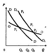 2. МЕХАНИЗМ ФУНКЦИОНИРОВАНИЯ РЫНКА: СПРОС, ПРЕДЛОЖЕНИЕ, РЫНОЧНОЕ РАВНОВЕСИЕ Рыночный механизм — это механизм взаимосвязи и взаимодействия основных элементов рынка: предложения, спроса и цены. Рассмотрим более подробно каждый элемент рыночного механизма. СПРОС И ФАКТОРЫ ЕГО ОПРЕДЕЛЯЮЩИЕЦены на товары и услуги складываются на рынке, где действуют спрос и предложение. В аспекте этих соображений рассмотрим последовательно проблемы, относящиеся к спросу и предложению. Спросом называется количество товаров и услуг, имеющееся на данном рынке, которое покупатель готов приобретать по определенной цене независимо от того, действует он рационально или под влиянием среды. Спрос на какой-либо продукт представляет собой спрос в отношении какой-то отрасли экономики. Практика показывает наличие значительного разнообразия продукции, предназначенной для удовлетворения запросов потребителей. Все виды продукции обладают различной степенью взаимозаменяемости. Комбинированная продукция отрасли может рассматриваться как товар или благо. Однако общим критерием принадлежности какого-либо продукта к той или иной отрасли могут служить определенные признаки (форма, качество, степень рекламирования и т.д.). Высокая заменяемость предполагает, что товары удовлетворяют одну и ту же потребность, но изменение цены на взаимозаменяемые товары может повлечь за собой изменение спроса от одного продукта к другому. Следовательно, механизм рынка позволяет удовлетворять только те потребности, спрос на которые растет. Индивидуальный и совокупный рыночный спрос на товарРассмотрим ситуацию, складывающуюся на рынке какого-нибудь товара А. Предположим, что при цене 30 $ за одну условную единицу покупатель готов купить лишь 1 единицу блага А, при цене 15 $ — 3 единицы и т.д. Зависимость количества проданных благ от уровня цен может быть представлена графиком (Рис. 3.1). Анализируя полученный график, легко заметить, что между рыночной ценой и количеством реализованного товара существует определенная обратная связь. Высокая цена товара ограничивает спрос на него, уменьшение же цены, как правило, обусловливает возрастание спроса на него. Изображенная кривая спроса характеризует состояние цен и объема продукции А на определенный момент времени. Данная кривая иллюстрирует закон изменения спроса. Она имеет отрицательный наклон, что свидетельствует о желании потребителей купить большее количество благ при меньшей цене. В общем виде QD=F(P), где QD — величина спроса (demand), Р — цена (price). Однако спрос — величина переменная. При этом следует различать изменение величины спроса, или объема опросов, и изменение характера спроса. Величина спроса меняется тогда, когда переменна только цена данного товара. Характер же спроса меняется тогда, когда изменяются факторы, имевшие ранее постоянные величины. Графически изменения объема спроса выражаются в "движении" по кривой спроса вниз или вверх (Рис. 3.1). Изменение же спроса выражается в "движении" кривой спроса, в ее смещении вправо или влево (Рис. 3.2). Представленная функция носит название функции спроса — функции, определяющей спрос в зависимости от влияющих на него различных факторов. Выше мы определили влияние ценового фактора. Однако на спрос оказывают влияние и иные факторы: => величина и динамика изменения дохода потребит