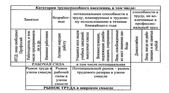 а) Равномерные колебания б) Расширяющиеся коле- в) Затухающие колебания цен бания цен цен Рис. 3.9 Графики колебания цен относительно цены равновесияЦена P2 побуждает производить больше товаров О3, которым соответствует уже более низкая цена Р3. Данный процесс повторяется от одного периода к другому. Производство и цены проходят через стадии О2Р2О3Р3. Такая ситуация характеризует случай — равновесие никогда не будет достигнуто. Происходят постоянные колебания цен относительно цены равновесия (Рис 3.9, а). 2. Наклон кривой предложения круче кривой спроса. Рис. 3.8, б показывает, что в этих условиях положение становится все более нестабильным, цена опускается настолько низко, что производство прекращается или не растет. Происходят расширяющиеся колебания цен: от одного периода к другому цены все более удаляются от цены равновесия (Рис 3.9, б). 3. Наклон кривой предложения меньше наклона кривой спроса. В этом случае, как показано на Рис. 3.8, в, и объем производства, и цена все более приближаются к уровню равновесия. Происходит сужающееся колебание цен (Рис 3.9, в). Паутинообразная модель может с достаточной степенью точности применяться лишь к определенной продукции, так как не учитывает ряд важных факторов (например, влияние климатических условий, изменение спроса потребителей и т.д.). Однако, она обладает достоинством, так как показывает зависимость функционирования рынка от времени реакции в сфере предложения и формы кривой предложения и спроса. 3. РЫНОК ТРУДА Рынок труда - это рынок ресурсов труда как товара, равновесная цена и количество которого определяются взаимодействием спроса и предложения. Это такая экономическая среда или пространство, на котором в результате конкуренции между экономическими агентами (предприниматели и трудоспособное население) через механизм спроса и предложения устанавливается определенный объем занятости и уровень оплаты труда. Использование рабочей силы осуществлялось за то или иное вознаграждение, плату в натуральной или денежной форме. Совокупность товарно-денежных отношений, охватывающая спрос и предложение рабочей силы, ее найм, (распределение работников по видам деятельности) и обмен на жизненные средства представляет собой рынок рабочей силы. Вознаграждается не потенциальная, а функционирующая рабочая сила; не вся совокупность способностей, а только первичные, профессиональные востребованные способности к труду. Это и есть рынок функционирующей рабочей силы. Рынка труда определяется разными признаками. Рассмотрим его исходя из критерия минимума числа компонентов, необходимых для возникновения и начала функционирования современного цивилизованного рынка труда в широком смысле. По указанному критерию можно выделить следующие компоненты: 1) субъекты рынка труда; 2) экономические программы, решения и юридические нормы, принятые субъектами; 3) рыночный механизм (спрос и предложение рабочей силы, цена рабочей силы, конкуренция); 4) безработица и социальные выплаты, связанные с ней; 5) рыночная инфраструктура. Первый компонент - субъекты рынка труда — это наемные работники (и их объединения - профсоюзы), работодатели (предприниматели) и их союзы, государство и его органы - абсолютное большинство занятых (около 90%). Рабочие - наибольшая часть наемных работников. Они составляют более 60% численности 