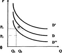 Рис. 3.2 Движение кривой спроса Эти факторы способствуют сдвигу кривой индивидуального спроса вправо или влево. Так, изменение денежных доходов потребителей предполагает сдвиг кривой в положение D’ (в случае их увеличения) и в положение D” (в случае их снижения). Эластичность спроса Понятие эластичности связано со спросом на товары в зависимости от их стоимости. Мерой такого измерения служит коэффициент эластичности спроса. А. Маршалл, развивавший эту тему, писал в своих "Принципах экономической науки", что "эластичность (responsiveness) может быть большей или меньшей в зависимости от того, сильнее или слабее возрастает приобретаемое количество товаров при данном снижении цен, и в большей или меньшей степени падает при данном повышении цен". Эластичность спроса определяется как отношение между процентной величиной изменений запрашиваемого количества товара и величиной колебаний цен.