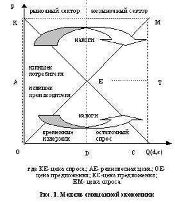 D C Рис. 2. Модель нерыночного сектора экономики Однако эта правая часть может быть обнаружена только при принятии всех изложенных выше посылок, образующих методологию экономического анализа рынка, т.е. методологию признания приоритета «потребности» - по сравнению со «спросом», и приоритета «экономики» - по сравнению с «рынком». Этим объясняется та удивительная, на первый взгляд, загадка, почему на графике равновесной цены странным образом весь предшествующий период отсутствовало графическое представление неплатежноспособной части потребности, а в результате – отсутствовал и анализ «неспросовой» части потребности. Впрочем, загадка крайне простая, - там, где нет превышения цены спроса над ценой предложения, не может быть и рынка, а там, где отсутствует рынок, отсутствует и участливый интерес «рыночника». Действительно, условие возникновения «нерыночного» сектора экономики противоположно условию возникновению рыночного сектора – функция нерыночного сектора экономики заключается в производстве благ в ситуации заведомого превышения «цены предложения» над «ценой спроса» (т.е. в ситуации превышения расходов производителя над его доходами). Понятно, что подобная ситуация, исключающая возможность получения дохода, означает невозможность и частного доходного предпринимательства. Потому-то нерыночный сектор экономики кажется «рыночникам» фантастикой, будучи сферой недоходного, убыточного производства. Теперь ничто не мешает нам построить уже целостную модель смешанной экономики как «двухсекторного производства» (Приложение 1), необходимо объединяющего «рыночную» и «нерыночную» формы его организации. Действительно, график, представленный на рис. 1. соответствует требованиям доходного предпринимательства (здесь, по условиям графика, доход обеспечен изначальным превышением цен спроса над ценами предложения); и наоборот, - график, представленный на рис. 2 соответствует требованиям убыточного производства (здесь, по условиям графика, цены предложения изначально выше, чем цены спроса). Нетрудно также заметить, что исходная точка графика 2 (Е – точка равновесия) есть конечная точка графика 1. И это не случайно: экономическая практика знает только одно состояние предпринимательства – «доходное». Невозможен доход – невозможен и рынок.Объеденив обе рассмотренные - рыночную и нерыночную – модели в рамках одного графика, мы и получаем обобщенную модель устройства современной экономики как экономической системы смешанного (двухсекторного) типа. При этом под «смешанностью» современной экономики следует понимать неизбежность и необходимость сочетания двух полярных, альтернативных, диаметрально-потивоположных форм организации общественного производства – «рыночной» и «нерыночной».То есть должен существовать особый баланс: с одной стороны - между величиной расходов, необходимых для удовлетворения потребностей, обеспечиваемых исключительно рынком «так называемых «классических товаров», и с другой стороны - между величиной расходов, необходимых для удовлетворения потребностей, обеспечиваемых исключительно государством (так называемых «общественных благ»). Представленная графическая модель смешанной экономики носит абстрактный характер, но дает понять ее суть. Конкретная экономика конкретной страны имеет свои п