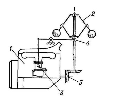Простейший пример САУ - система прямого регулирования частоты вращения двигателя (рис. 1). Цель управления - поддержание постоянной частоты вращения маховика, управляемый объект - двигатель 1; управляющее воздействие - положение регулирующей заслонки дросселя 3; УУ - центробежный регулятор 2, муфта 4 которого смещается под действием центробежных сил при отклонении от заданного значения частоты вращения вала 5, жестко связанного с маховиком. При смещении муфты изменяется положение заслонки дросселя. Структурная схема рассмотренного примера (рис. 2) типична для многих САУ вне зависимости от их физической природы. Описанная система представляет собой замкнутую одноконтурную непрерывную систему автоматического регулирования механического действия, допускающую линеаризацию при исследовании.