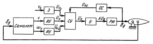 dв — угол отклонения руля высоты; nз— заданное значение угла тангажа; n— угол тангажа; 3 — задатчик угла тангажа; ИУ — измерительные устройства (датчики n и vn); Unз, Un, Uvn— напряжения, пропорциональные значениям nз, n, vn; СУ — суммирующее устройство; Uос — напряжение обратной связи; US— суммарное напряжение; У — усилитель; ОС — датчик обратной связи; k — коэффициент усиления усилителя; РМ — рулевая машина Рис. 1. Функциональная схема автоматического управления рулями высоты В состав каждого канала входят измерительные устройства ИУ, суммирующие устройства СУ, усилительные (У) и исполнительные устройства (РМ). Измерительные устройства ИУ автопилотов типа АП (например, датчики углов крена, тангажа, курса, высоты и т. п.) измеряют значения отклонений угла и угловой скорости (например, угла тангажа n, угловой скорости тангажа vn) и преобразуют эти отклонения в величины напряжений Un и Uv. После алгебраического суммирования в суммирующем устройстве СУ сумма напряжений US усиливается усилителем У и подается на рулевую машину РМ автопилота. Последняя отклоняет руль высоты, в результате чего появившееся отклонение угла тангажа ликвидируется. Список литературы1. Теория автоматического управления. /Под ред. Воронова А.А.-М.; Высш.шк. 2. Макаров И.М., Менский Б.М. Линейные автоматические системы.-М.: Машиностроение, 1982. 3. Системы с переменной структурой и их применение в задачах автоматизации полёта, М., 1968. 4. Воронов А. А., Основы теории автоматического управления, ч. 3, М. - Л., 1970. 5. Емельянов С. В., Системы автоматического управления с переменной структурой, М., 1967. |