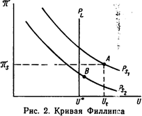 Краткосрочная кривая Филлипса, изображенная на рис. 2 (ps1, ), показывает, что каждому значению (показателю темпов инфляции соответствует определенный уровень безработицы. Снижение темпов инфляции оборачивается ростом безработицы. Попытки повысить уровень занятости сопровождаются усилением инфляции. Это ставит перед экономической наукой сложнейшую проблему: найти ориентир, на достижение которого должна быть направлена бюджетная, фискальная и, прежде всего, кредитно-денежная политика в переходный период. Из бесчисленного множества альтернативных возможностей нужно отыскать такое сочетание темпа инфляции и уровня безработицы, при котором совокупный негативный эффект безработицы и инфляции был бы минимальным. В качестве одного из подходов к решению этой проблемы можно порекомендовать следующее. Определить на базе специальных социологических исследований предельный социально-допустимый уровень безработицы (Us на рис. 2) и проводить последовательно жесткую кредитно-денежную, фискальную политику и политику бюджетных расходов, подавляя инфляцию до тех пор, пока безработица не приблизится к предельно допустимому уровню. По его достижении политика воздействия на совокупный спрос должна стать более гибкой, не допускающей дальнейшего роста безработицы. По вертикальной оси Л откладываются показатели темпа (уровня) инфляции, по горизонтальной оси U показатели уровня безработицы. Кривая Филлипса краткосрочная —Ps, долгосрочная—pl, U—естественный уровень безработицы. Искомый результат, изображенный на рис. И в виде точки А с координатами Лs, Us, может рассматриваться, однако, только как промежуточный (краткосрочный) ориентир экономической политики. Долгосрочная ее цель состоит в том, чтобы снизить одновременно темпы инфляции и уровень безработицы. Для этого необходимо преодолеть спад в экономике Экономический подъем сопровождается ростом реальных доходов, что позволяет сохранить или даже полностью устранить дефицит госбюджета даже при снижении налоговых ставок. При этом отпадает необходимость постоянного ин-фляционного взбадривания деловой активности средствами кредитно-денежной политики. В результате движение экономкой в сторону полной занятости не сопровождалось 6ы больше повышением темпов инфляции. В терминах краткосрочной кривой Филлипса это означало бы ее смещение влево—вниз из положения Ps1, в положение Рs2, что позволило бы перейти из точки А, например, в точку В или какую-либо иную точку на кривой Ps, также характеризующуюся более низким темпом инфляции и уровнем безработицы.