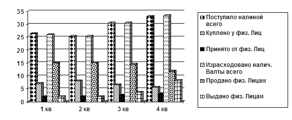 Столбиковые (сравнительные). Движение наличной иностранной валюты через уполномоченные банки в I-IV кварталах 1997г. (в млрд. $)