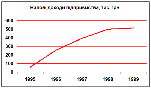 Майже незмінний результат, отриманий в 1999 році в порівнянні із 1998 роком пов”язаний з тим, що на початку 1999 року підприємство придбало приміщення, яке раніше орендувало, та два автомобілі, необхідні для діяльності. Це призвело до того, що кошти, які було вкладено в діяльність підприємства у 1999 році були приблизно ті ж самі, що і в 1998. 2.2. Динаміка доходівУ таблиці 1 представлено динаміку доходів підприємства, з якої можна зробити висновки стосовно зростання валових доходів. Для розрахунків в якості базового року було обрано 1996, т.я. у 1995 році підприємство працювало лише два місяці. Цим же пояснюється стрімке зростання (більш ніж у чотири рази) валового прибутку у 1996 році. Таблиця 1. Динаміка валового прибутку підприємства