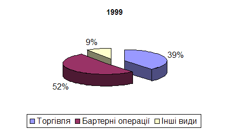 5. Коефіцієнт варіації розрахуємо за формулою: V = Розрахований коефіцієнт варіації знаходиться в проміжку 10-25 %, що свідчить про значну варіацію досліджуваної ознаки. 2.4. Структура доходівЯк вже було сказано вище, найбільш рентабельними є бартерні операції. Місце таких операцій в структурі валового прибутку підприємства у 1996 та 1999 роках було таким (табл. 2.): Таблиця 2. Структура валового прибутку підприємства (по видах діяльності)
