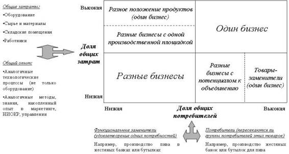 Идентификация бизнесов компании. Избыточность промышленной инфраструктуры и активов, ограниченность финансовых и человеческих ресурсов, а также постепенная потеря конкурентоспособности продукции промышленных предприятий стран СНГ ведет к необходимости коренной реорганизации предприятий и концентрации на наиболее конкурентоспособных бизнесах. Первоочередной шаг в данном направлении - выделение непрофильных для предприятия бизнесов, к которым относятся вспомогательное и заготовительное производства. Судьба этих бизнесов, при наличии возможности приобретения производимой ими продукции по кооперации (передача на аутсорсинг), - выделение и последующая продажа. Данный сценарий не реализуется только в случае, если продукции вспомогательного и заготовительного производств имеет или может иметь более сильную конкурентную позицию на рынке, нежели продукция основного бизнеса. Второй шаг - идентификация и сравнение конкурентоспособности основных бизнесов. Для идентификации основных бизнесов можно использовать следующую матрицу: