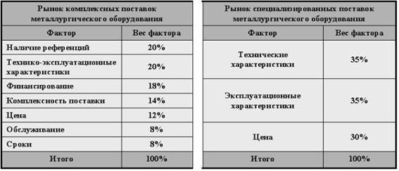 Но даже после того, как были идентифицированы основные бизнесы, может возникнуть проблема: классифицированный по вышеприведенной матрице бизнес на предприятиях на постсоветском пространстве может не иметь ничего общего с аналогичным бизнесом "по мировым меркам". Так, например, в мире нет производителей, которые поставляли ли потребителю только гидравлические карьерные экскаваторы. Caterpillar, Liebherr, Komatsu, O&K, Hitachi осуществляют комплексные поставки оборудования для открытых горных разработок: экскаваторы, погрузчики, самосвалы, грейдеры, скреперы, другую технику. И при сопоставимых ценах вероятность приобретения отдельно взятого экскаватора у производителя из СНГ стремится к нулю. Однако, данный пример относится уже к следующему этапу работ - этапу стратегического анализа и прогноза конкурентоспособности бизнесов. Анализ и прогноз отраслевых тенденций. Поиск перспективных продуктов и технологий При проведении анализа отраслевых тенденций важно не замыкаться на анализе тенденций на традиционных рынках: для большинства производителей промышленной продукции стран СНГ это постсоветское пространство. Можно привести множество примеров, когда технологии активно используемые в странах СНГ, зарубежом давно вытеснены более современными и эффективными. Например, практически нигде в мире (за исключением лишь нескольких стран) для открытых горных разработок не приобретаются канатные карьерные экскаваторы. С конца 70х годов, это техника постепенно вытесняется гидравлическими экскаваторами. Или другой пример - сельскохозяйственные тракторы: в мире доля гусеничных тракторов в парке не превышает 10% и эта техника используется при проведении работ в специфических почвенно-климатических условиях, на больших пространствах или в странах с гористым рельефом местности. Однако, например, в России доля гусеничных тракторов в парке составляет около 40%. Возникает закономерный вопрос: насколько массовым будет спрос в России на гусеничные трактора в перспективе 5-10 лет и имеет ли смысл сейчас делать ставку на эту технику? Возможно, более рационально рассматривать гусеничные тракторы как "дойную корову", параллельно инвестируя в разработки колесных тракторов или концентрируясь на других перспективных нишах для гусеничных тракторов - например, дорожно-строительной технике, прежде всего, бульдозерной. Прогноз долгосрочной конкурентной позиции компании по каждому бизнесу (продукту). Анализ и прогноз рыночной позиции конкурентов Конкурентная позиция компании на рынке определяется степенью соответствия продукции компании КФПР - ключевым факторам принятия решения покупателем о покупке. Анализируя степень соответствия продукции компании и продукции конкурентов КФПР, принимая во внимание текущую долю компании на рынке, можно четко прогнозировать изменение конкурентной позиции компании и прилагать целенаправленные усилия по укреплению позиции компании на рынке. С другой стороны, анализ КФПР на разных рынках, позволяет идентифицировать целевые для компании рынки. Рассмотрим, например, рынки для производителей металлургического оборудования и КФПР на каждом из этих рынков. Выделяется 2 принципиальных рынка: комплексных (завод) и специализированных (узлы и отдельные виды оборудования) поставок.