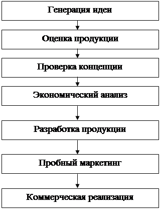 Рис. 3.5. Процесс планирования новой продукции В ходе этого долгосрочного процесса фирма осуществляет: генерацию идей, оценку продукции, проверку концепции, экономический анализ, разработку продукции, пробный маркетинг и коммерческую реализацию товаров и услуг. На этапе прогнозирования новых товаров необходимо провести фильтрацию продукции. Для первичной оценки уровня конкурентоспособности планируемой к производству продукции может быть использован стандартизированный состав важнейших параметров продукции (табл. 3.2), применяемых на американских фирмах. В каждой группе приведенных показателей оценивается несколько важнейших параметров продукции по шкале от 1 (превосходно) до 10 (плохо) баллов. Кроме того, взвешивается возможность каждого параметра продукции, поскольку они различным образом влияют на ее конкурентоспособность. Например, продукт А получает оценку 2,5 по общим показателям, 3,0 - по маркетинговым и 1,5 – по производственным. Товар В имеет соответствующие оценки: 3,0; 1,5 и 2,0. Компания установила весовые значения: 4 — общим характеристикам 5 - маркетинговым и 3 - производственным. Тогда продукт А получает совокупную оценку 29,5 (2,5 • 4 + 3,0 • 3 + 1,5 • 3), а товар В — 25,5 (3,0 • 4 + 1,5 • 5 + 2,0 • 3). Из этого примера видно, что продукт В оказался более конкурентоспособным, поэтому его следует рекомендовать к долгосрочному производству. Таблица 3.2. Перечень оценочных показателей новой продукции.