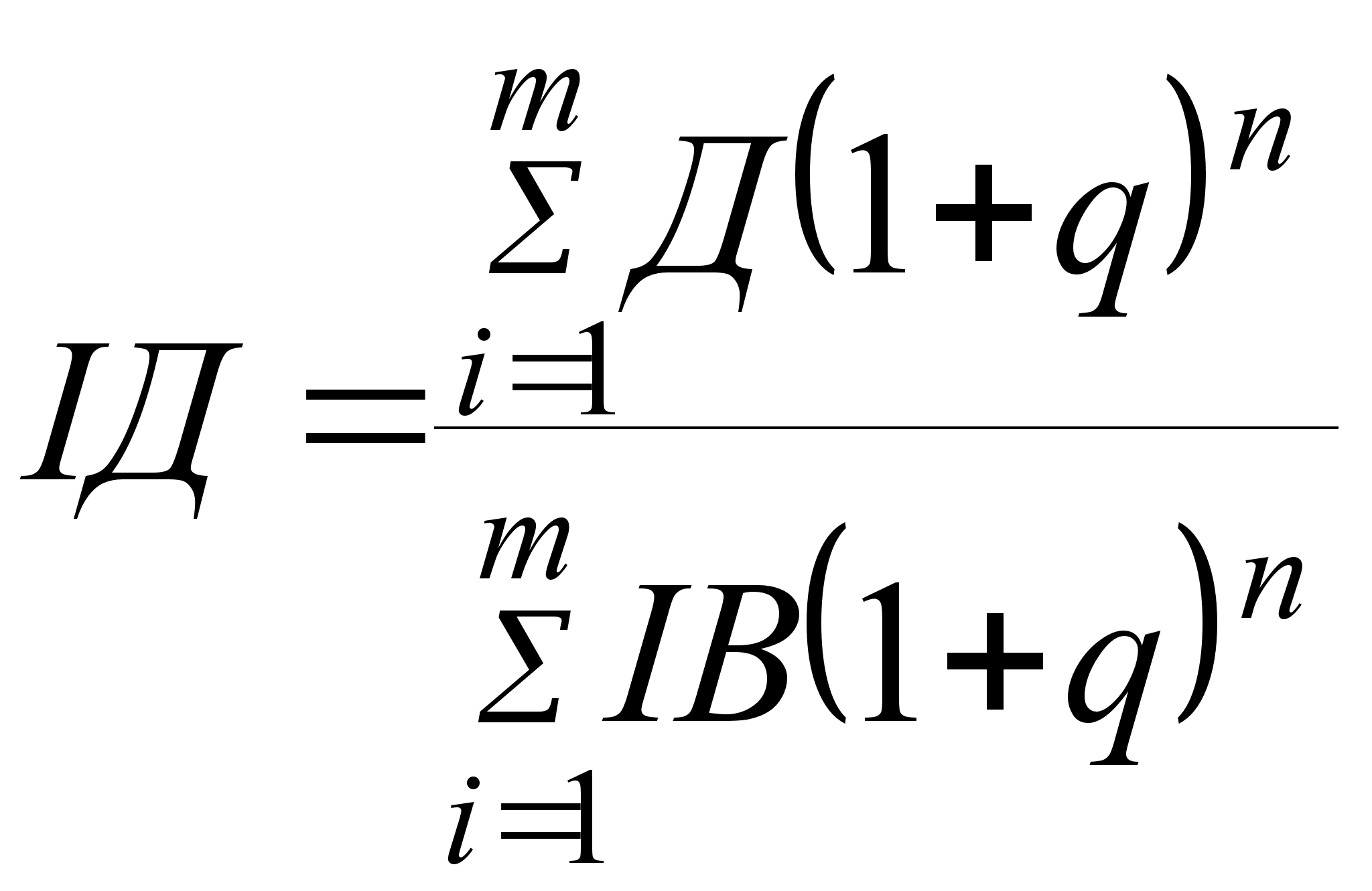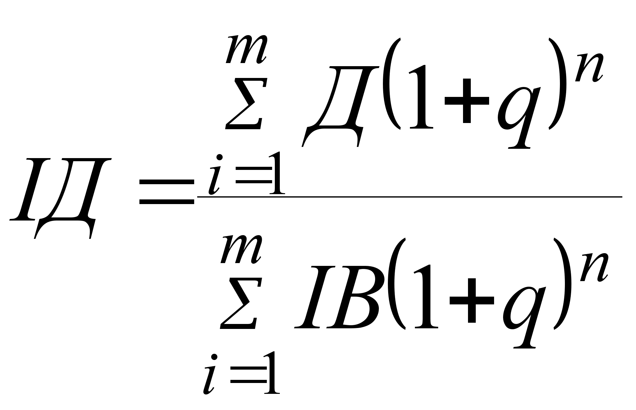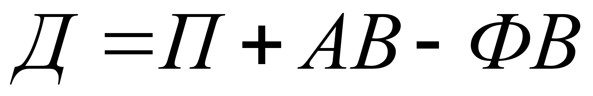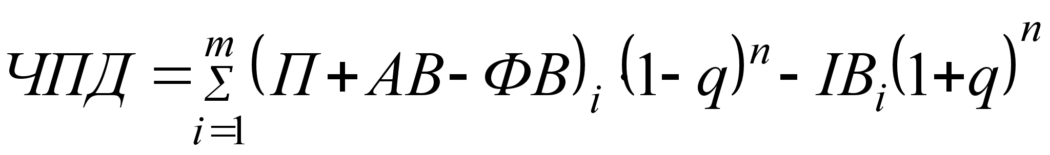 де q — ставка дисконту або необхідна ставка доходу; i — порядковий номер року розрахункового доходу; m — розрахунковий період роки; n — кількість років, що відокремлює витрати (результати) конкретного року від розрахункового. Перш ніж розраховувати решту показників, введемо позначення: Д = П + АВ - ФВ (1.4) Визначимо рентабельність, або індекс доходності проекту (ІД):
