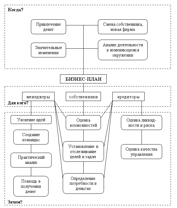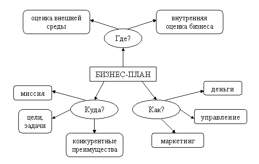 Итак, назначение бизнес плана в том, что он помогает предпринимателям решать следующие задачи: 1. Изучить емкость и перспективность развития будущего рынка сбыта; 2. Оценить затраты для производства нужной рынку продукции, соизмерить их с ценами, по которым можно будет продавать свои товары, чтобы определить потенциальную прибыльность дела; 3. Обнаружить всевозможные "подводные" камни, подстерегающие новое дело в первые годы его реализации; 4. Определить те показатели, по которым можно будет регулярно контролировать состояние дел. Бизнес-план обычно пишется на перспективу, и составляют его примерно на 3 года вперед, при этом для первого года основные показатели обычно делают в месячной разбивке, для второго – поквартально, и лишь начиная с 3-го года, ограничиваются годовыми показателями. К сожалению, такое планирование в условиях нашей экономики пока не представляется возможным, поскольку экономическая ситуация очень быстро меняется. Планирование на время более года будет заведомо ошибочным. Многие сейчас ограничиваются написанием плана на год. Что входит в бизнес-план? Любая предлагаемая форма дает лишь общее представление. Любой бизнес имеет свои особенности, следовательно, не может существовать некоего "стандартного" плана, приемлемого во всех случаях. Существует один испытанный принцип составления любого бизнес-плана: ОН ВСЕГДА ДОЛЖЕН БЫТЬ КРАТКИМ. Правда, иногда, чтобы адекватно раскрыть суть проблемы, его делают достаточно пространным, но в то же время, чтобы у читающего не ослабевал интерес, не чрезмерно перегружают его. Большинство проектов ограничиваются 10-20 страницами. Ключевыми составляющими каждого бизнес-плана являются три М - management, marketing, money. Разделы, связанные с управлением, маркетингом и финансированием проекта, обязательно присутствуют в любом бизнес-плане. Другие разделы могут меняться в зависимости от специфики деятельности фирмы и проекта. Представленное содержание бизнес-плана является не более чем схемой. Тем не менее, оно содержит все главные моменты, которые необходимо предусмотреть. 1. Резюме o Цель плана o Потребность в финансах, их предназначение и для каких целей они необходимы o Краткое описание бизнеса и его целевого клиента o Что делает бизнес фирмы непохожим на бизнес конкурентов o Что именно должно вызывать доверие к фирме и ее бизнесу (отчетные материалы, квалифицированность руководителя группы и т.д.) o Выдержки из основных финансовых предложений 2. Цели и задачи o Анализ идеи o Основные направления и цели деятельности o Характеристика отрасли промышленности 3. Продукт (услуга) o Описание продукции/ услуги и их применение o Отличительные качества или уникальность o Технология и квалификация, необходимые в этом бизнесе o Лицензии/патентные права o Будущий потенциал 4. Анализ рынка o Покупатели o Конкуренты (их сильные и слабые стороны) o Сегменты рынка o Размер рынка и его рост o Оценочная доля на рынке o Состав клиентуры фирмы o Влияние конкуренции 5. План маркетинга o Маркетинговая расстановка (обеспечение конкурентоспособности продукции/услуг) - основные характеристики продукции/услуг в сравнении с конкурирующими o Ценообразование o Схема распространения товаров o Методы стимулирования продаж 6. План производства o Расположение помещений o Оборудование o Источники поставки основных материал