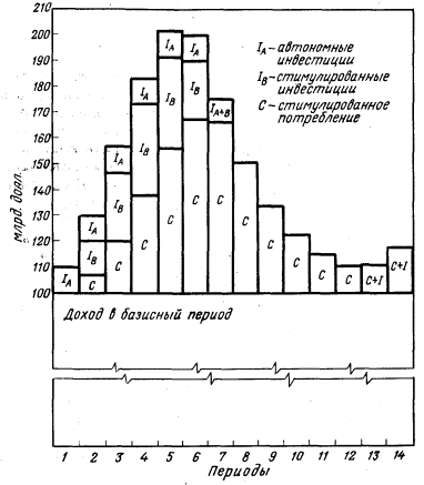 * Предельная склонность к потреблению равна 1/2, а акселератор равен ** Числа этой колонки увеличиваются в каждый период на 1/2 приращения дохода, имевшего место в предшествующий период.