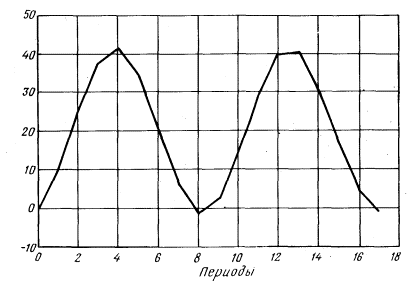 Pиc. 2. Автономные инвестиции, стимулированное потребление и стимулированные инвестиции Вполне возможно, что более реалистичными были бы менее крупные числовые значения мультипликатора и акселератора, чем те, которые приняты в табл. 1. Но в целях иллюстрации примем на сей раз, что предельная склонность к потреблению равна 1/2, а акселератор равен 2. Мы получаем в результате совершенно ровный по очертаниям, бесконечно повторяющийся цикл. Соответствующие выкладки представлены в табл. 2 и в форме диаграммы на рис. 3. Таблица 1. Взаимодействие мультипликатора и акселератора* (в млрд. долл.)