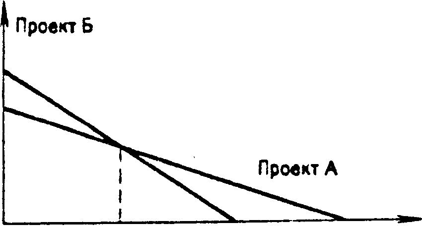 Рисунок 2.2 Как видно из рисунка 2.2, инвестиционный проект Б более желателен при ставке дисконтирования меньше 14%. Таким образом при анализе инвестиций методом IRR нельзя упускать из виду размер инвестиций. Если взаимоисключающих инвестиций больше двух, то придется попарно сравнивать инвестиционные проекты и повторив процедуру n-1 раз, получим проект-победитель. 3. Одним из существенных недостатков критерия IRR. является и то, что в отличие от критерия NPV он не обладает свойством аддитивности, т.е. для двух инвестиционных проектов А и Б, которые могут быть осуществлены одновременно: IRR (А+Б)IRR(А)+IRR(Б). NPV обладает этим свойством. 4. Критерий IRR. совершенно не пригоден для анализа неординарных инвестиционных потоков (название условное). В предыдущих параграфах рассматривались стандартные, наиболее простые и типичные ситуации, когда денежный поток развивается по вполне определенной схеме: инвестиция или отток капитала (со знаком “—” в расчетах) и поступления или приток капитала (со знаком “+” в расчетах). Однако возможны и другие, неординарные ситуации, когда отток и приток капитала чередуются. В частности, вполне реальна ситуация, когда проект завершается оттоком капитала. Это может быть связано с необходимостью демонтажа оборудования, затратами на восстановление окружающей среды и др. Оказывается, что в этом случае некоторые из рассмотренных аналитических показателей с изменением исходных параметров могут меняться в неожиданном направлении, т. е. выводы, сделанные на их основе, могут быть не всегда корректны. Резюмируя все вышеизложенное, можно отметить, что для ранжирования взаимоисключающих проектов NPV может служить критерием тогда, когда ставка дисконтирования равняется соответствующей альтернативной стоимости капитала. IRR предпочтительно использовать для того, чтобы знать разницу между прогнозируемой IRR и требуемой доходностью. Эта разница- запас прочности, позволяющей сопоставить доходность инвестиций и риск. Если применяется метод NPV, то правила принятия инвестиционных решений следующие: