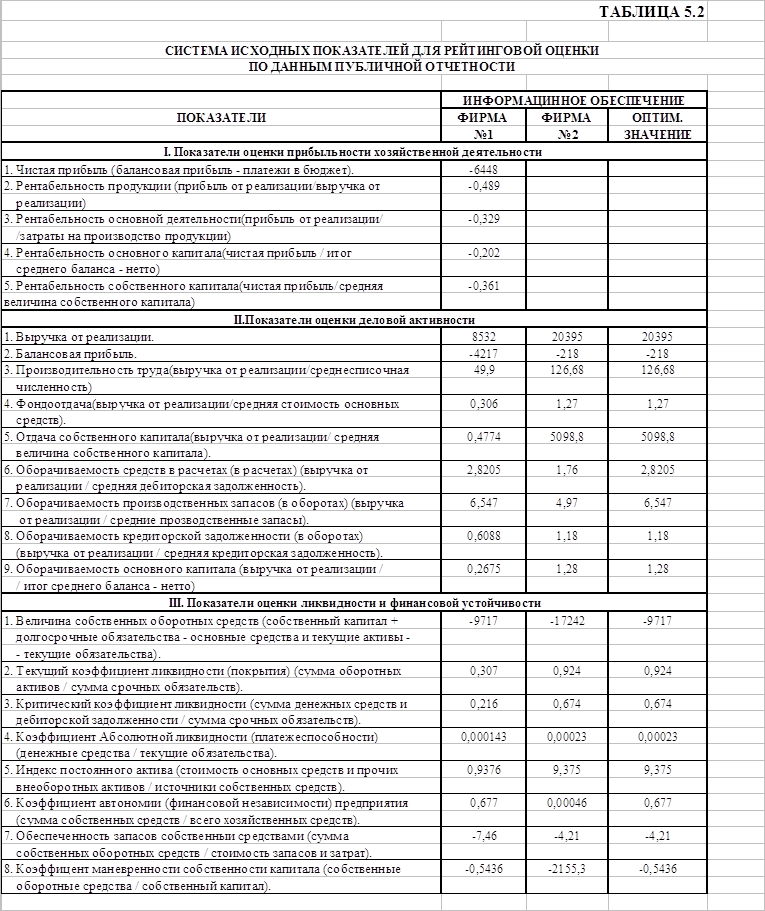 Комплексная сравнительная рейтинговая оценка финансового состоянияи деловой активности предприятияДля рейтинговой оценки используются данные о производственном потенциале предприятия, рентабельности его продукции, эффективности использования производственных и финансовых ресурсов, состоянии и размещении средств, их источниках и другие показатели. В таблице 5.2 приведен набор исходных показателей для общей сравнительной оценки, базирующейся на данных публичной отчетности предприятия.