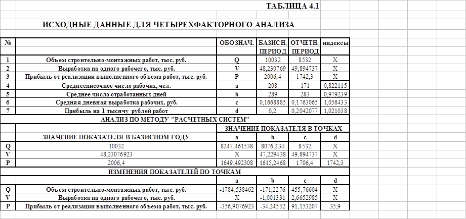 4. Факторный анализ 4.1. Способ «расчетных систем» Вычислим для заполнения таблицы исходных данных для четырехфакторного анализа: – выработку на одного рабочего для базового и отчетного периода; – среднюю дневную выработку рабочих для базового и отчетного периодов; – прибыль на одну тысячу рублей для базового и отчетного периодов. выработка на одного рабочего: