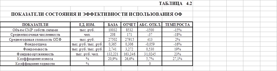Выводы: 1. Для объема СМР можно сделать следующие заключения: – фактор a вызвал уменьшение объема СМР на 1784,53846 тыс. руб.; – фактор b вызвал уменьшение объема СМР на 171,2276 тыс. руб.; – фактор с вызвал увеличение объема СМР на 455,766 тыс. руб. Следовательно, неиспользованными резервами для объема СМР являются влияния факторов a и b, и исключив их отрицательное влияние можно улучшить технико-экономические показатели, связанные с объемом СМР. 2. Для выработки на одного рабочего можно сделать следующие заключения: – фактор b вызвал уменьшение выработки на одного рабочего на 1,00131; – фактор с вызвал увеличение выработки на одного рабочего на 2.665298. Следовательно, неиспользованными резервами для выработки на одного рабочего являются влияния факторa b, и исключив иго отрицательное влияние можно улучшить технико-экономические показатели, связанные с выработкой на одного рабочего. 3. Для объема СМР можно сделать следующие заключения: – фактор a вызвал уменьшение прибыли на 356,907692 тыс. руб.; – фактор b вызвал уменьшение прибыли на 34,24552 тыс. руб.; – фактор с вызвал увеличение прибыли на 91,15321 тыс. руб. – фактор d вызвал увеличение прибыли на 35,9 тыс. руб. Следовательно, неиспользованными резервами для прибыли являются влияния факторов a и b, и исключив их отрицательное влияние можно улучшить технико-экономические показатели, связанные с прибылью. 4.2. Анализ состояния и эффективности использования ОФ Для характеристики степени использования основных фондов рассчитываются показатели фондоотдачи и фондоемкости. Для характеристики технической оснащенности строительных рабочих и ее влияния на уровень использования основных фондов рассчитываются показатели фондовооруженности, механовооруженности и энерговооруженности труда рабочих. Анализ состояния основных фондов производится на основе вычисления коэффициентов износа и годности (см. табл.4.2)