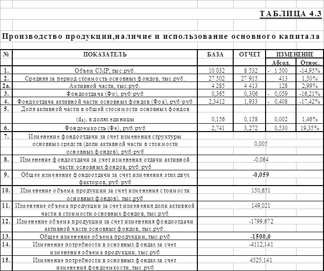 Общее отклонение фондоотдачи равно абсолютному отклонению фондоотдачи в таблице 4.3, а значит, изменение фондоотдачи за счет изменения структуры основных фондов и за счет изменения фондоотдачи активной части основных фондов были посчитаны правильно.