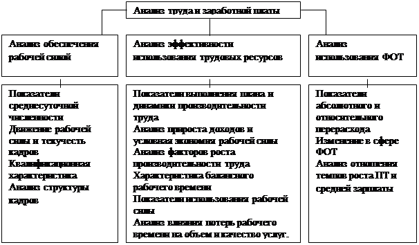 Вывод: проведенный анализ показал, что коэффициент оборачиваемости увеличивается на 27% или на 0,26 оборота при этом уменьшается длительность одного оборота на 21,1 дней, а следовательно, использование оборотных средств улучшилось. Высвобождения средств из оборота не наблюдалось, рассчитаем условную потребность в оборотных средствах в отчетном периоде по сравнению с базовым, а также сумму привлеченных дополнительно средств в оборот. Условная потребность в оборотных средствах: Фусл = Dm/Кобо; Фусл =204,8/1,22 =167,8 тыс. грн. Недостача оборотных средств на сумму 168 – 167,8 = 0,2 тыс. грн. 2.2.3 Анализ труда и заработной платы Труд, рабочая сила выступает в качестве важнейшего ресурса и основного условия производственного процесса. Схема анализа труда и заработной платы