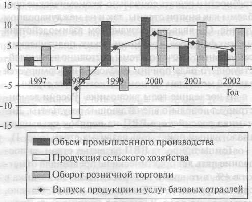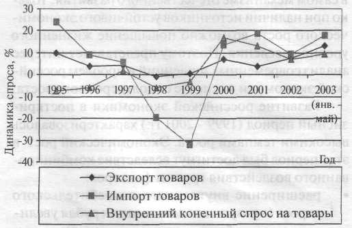 Рис. 1. Динамика прироста ВВП, (в % к предыдущему году) '2003 г. — прогноз. Источник: журнал «Экономический анализ», №12, 2003г. Экономический рост в этот период был достигнут вследствие комбинированного воздействия группы факторов: • расширение внутреннего потребительского спроса (в результате девальвации рубля увеличилось потребление отечественных товаров и услуг); относительно низкий рост тарифов естественных монополий;